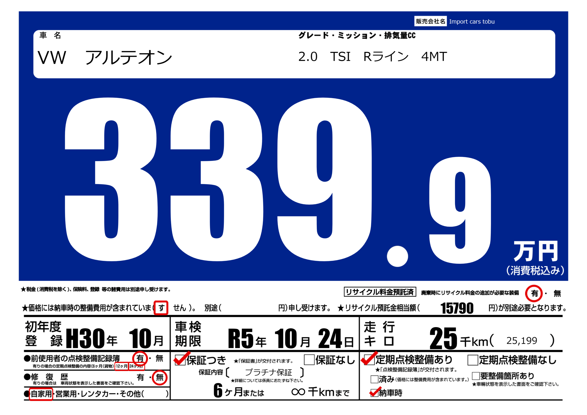 | 車名 | VW アルテオン | グレード ミッション 排気量 |