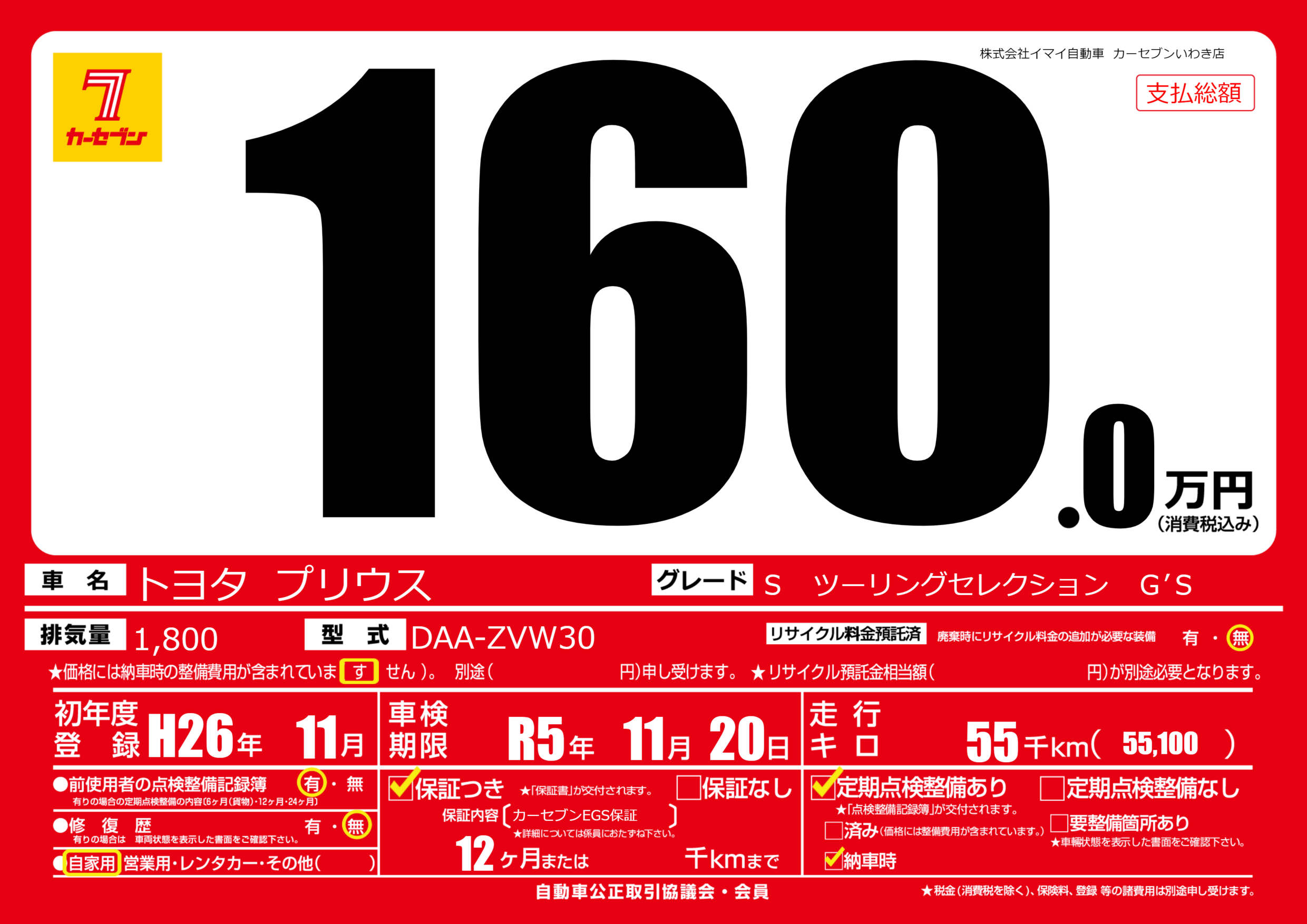 | 車名 | トヨタ プリウス | グレード ミッション 排気量 |