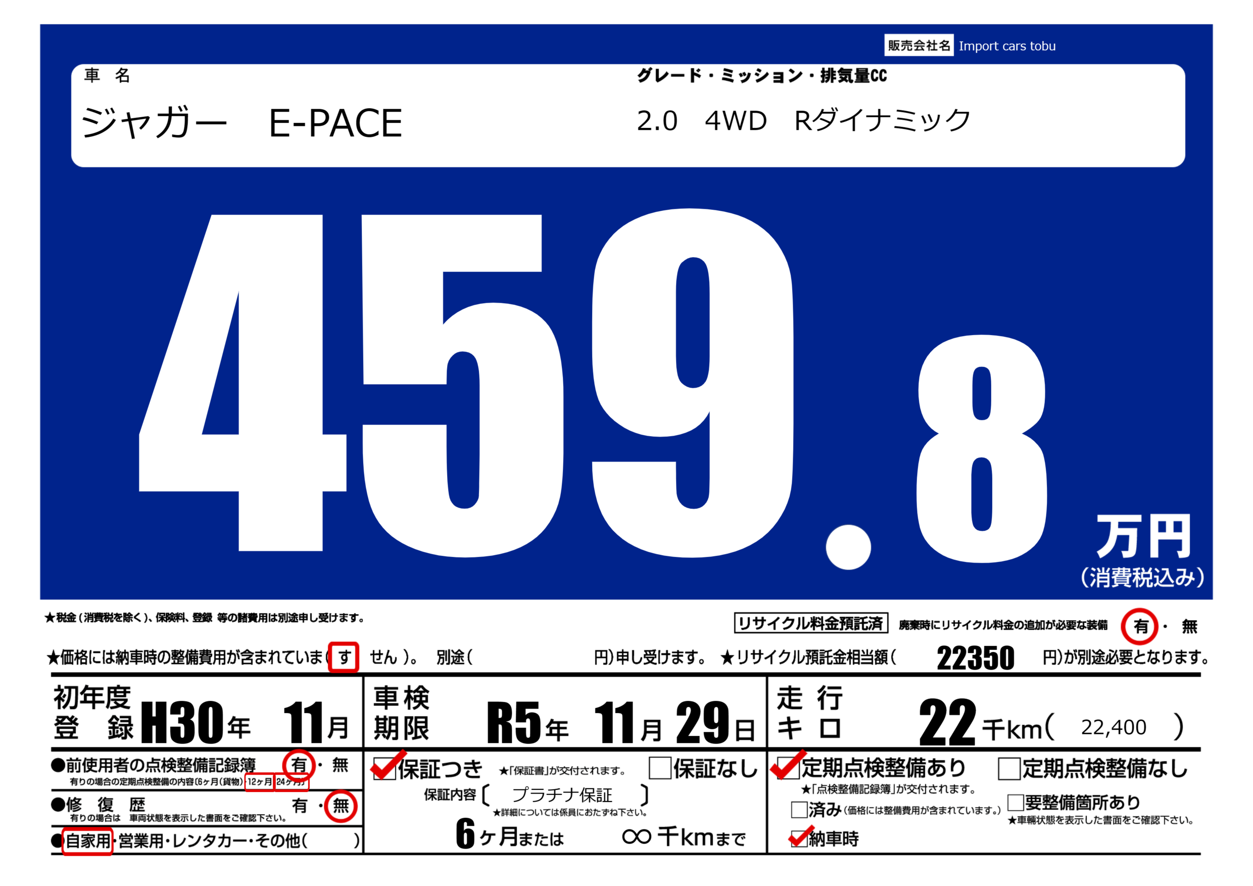 保証付き 保証内容( プラチナ保証) 6ヶ月または(∞)千kmまで |