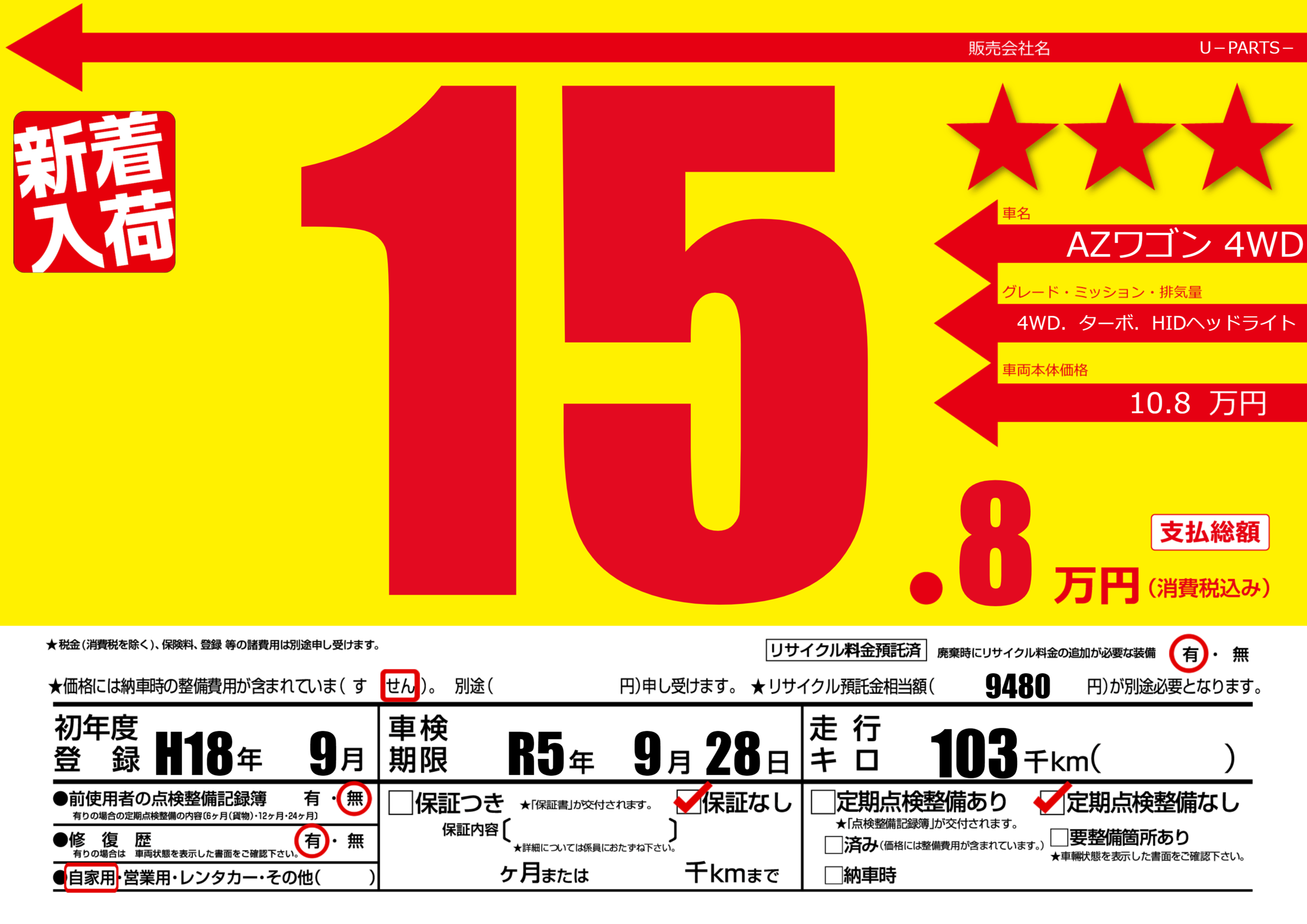 | 走行キロ | 10.3万km | 初年度登録 | H18年9月 |