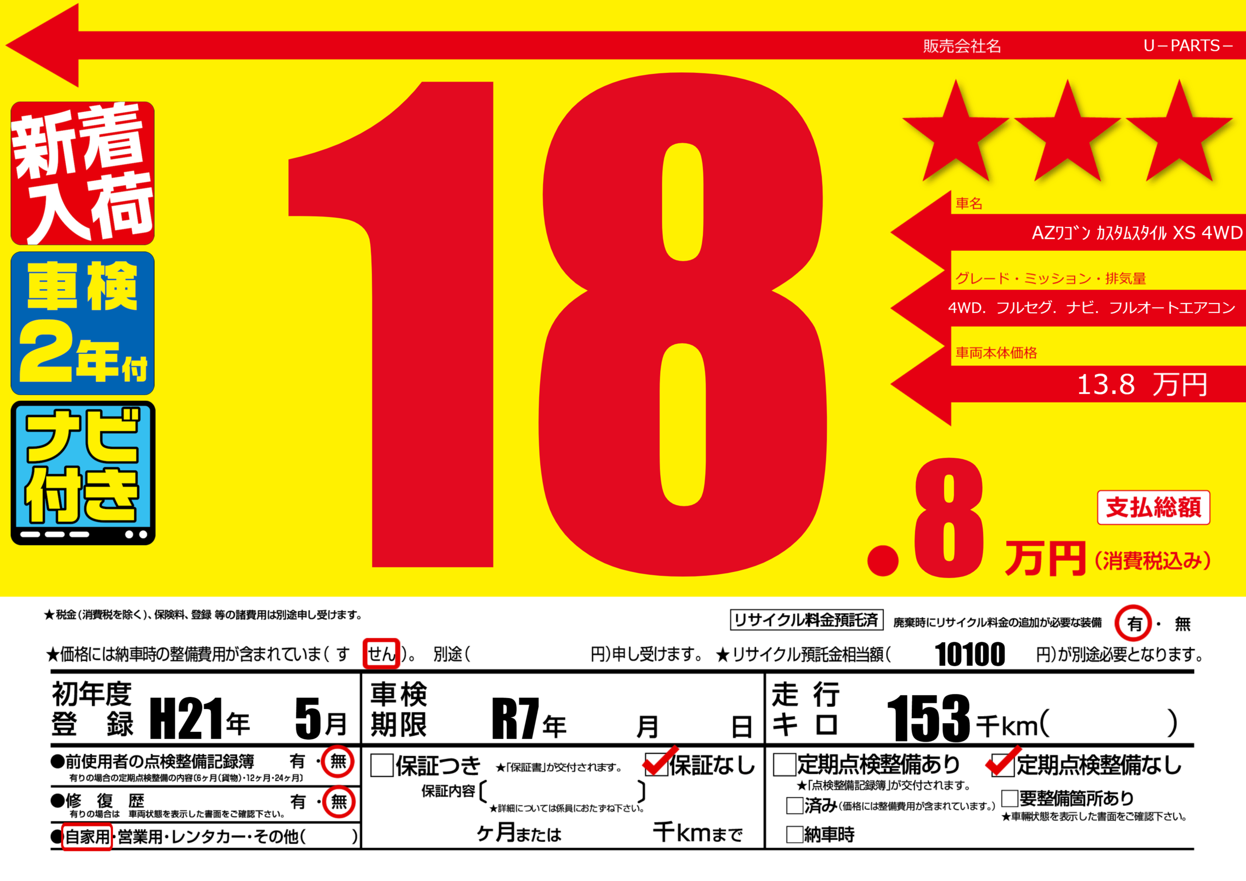 | 車名 | AZワゴン カスタムスタイル XS 4WD | グレード ミッション 排気量 |