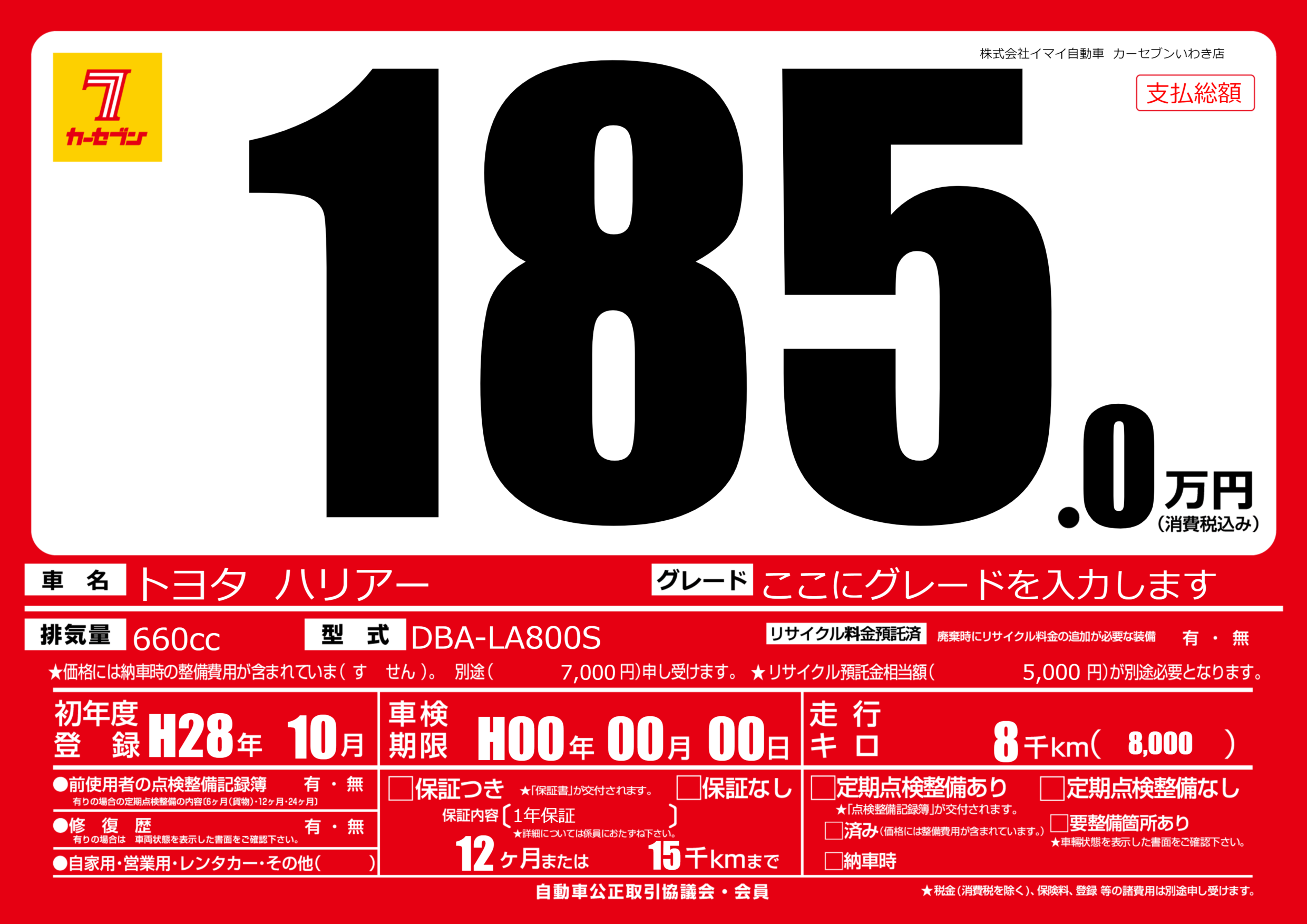 保証なし 保証内容(1年保証) 12ヶ月または(15)千kmまで |