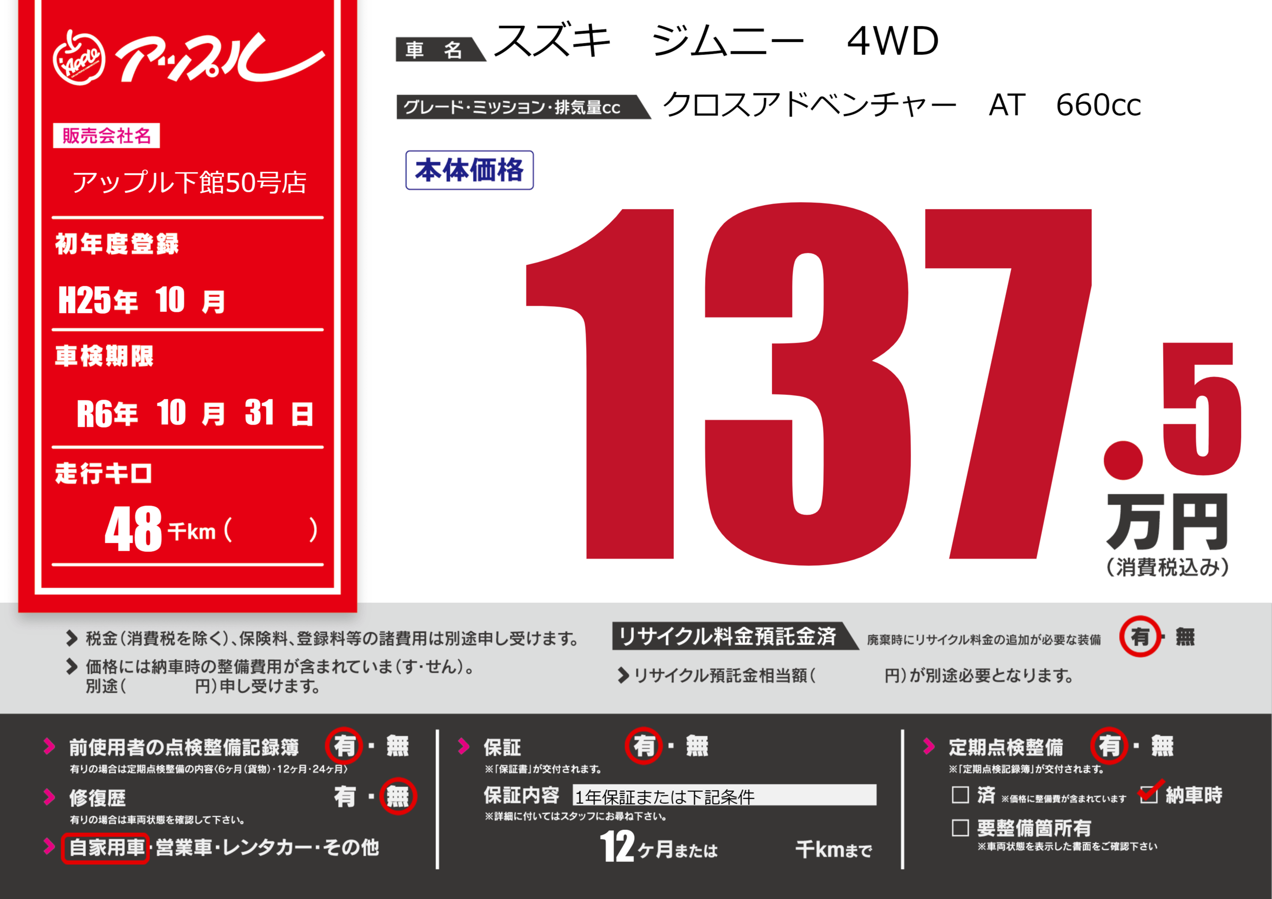 | 走行キロ | 4.8万km | 初年度登録 | H25年10月 |