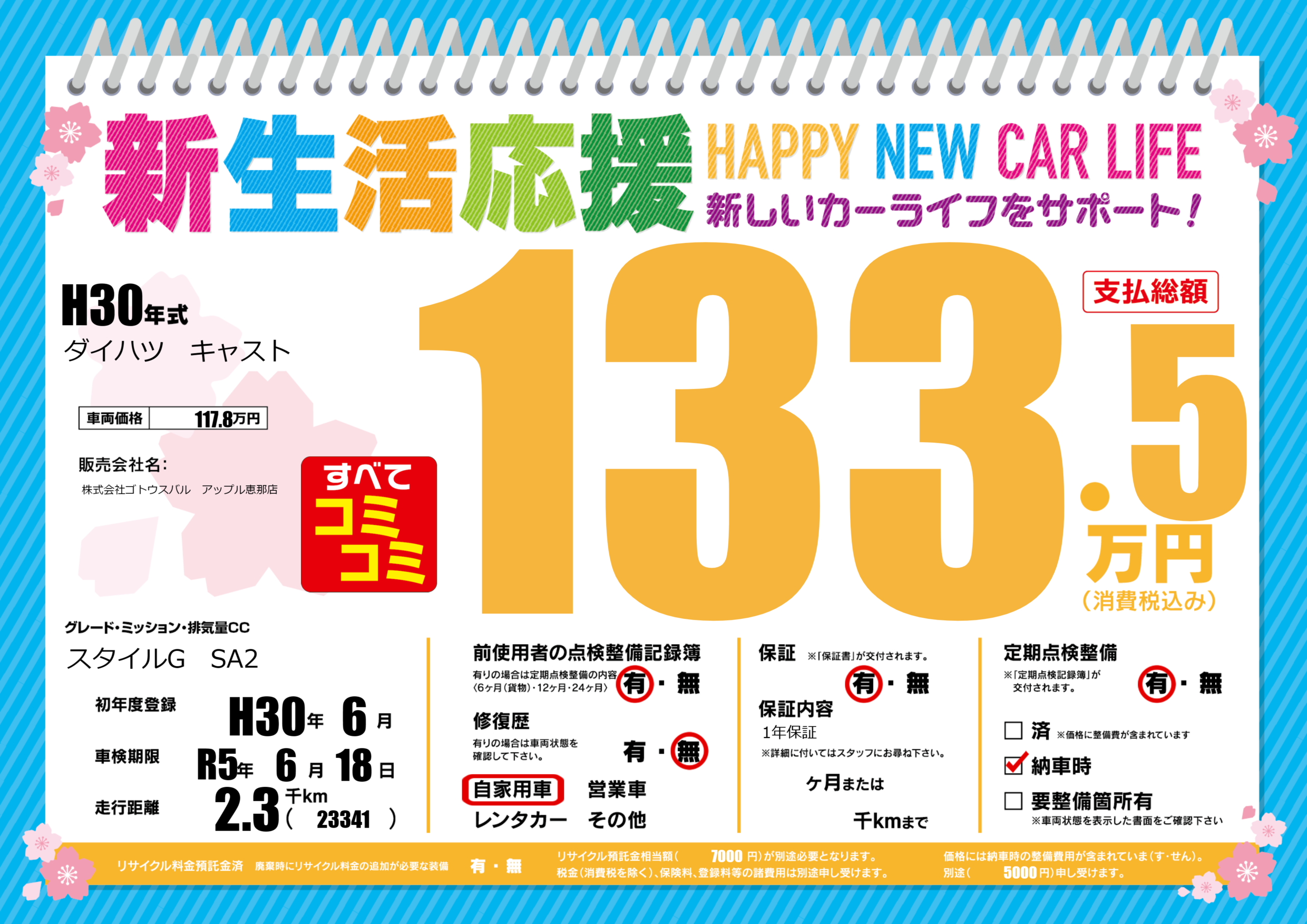 | 車名 | ダイハツ キャスト | グレード ミッション 排気量 |
