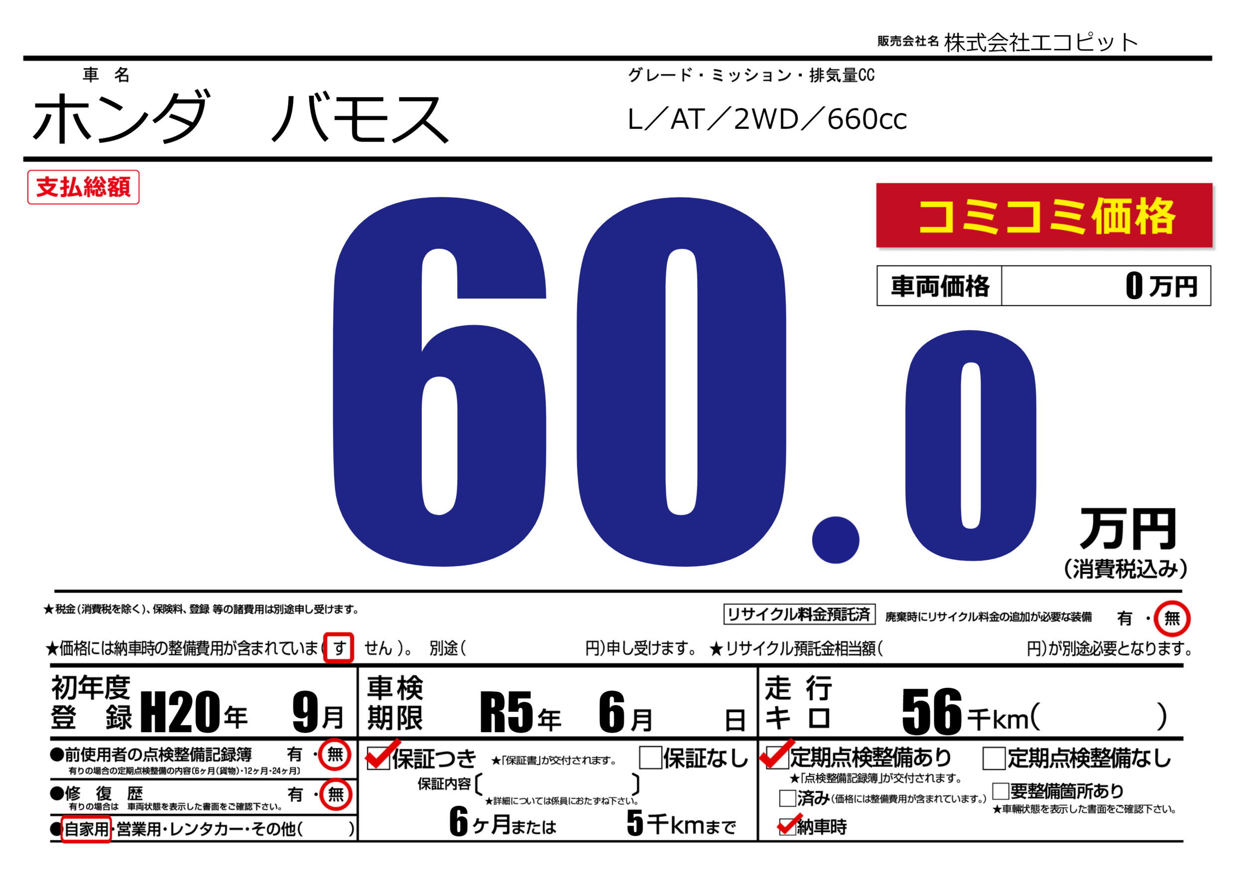 | 車名 | ホンダ バモス | グレード ミッション 排気量 |