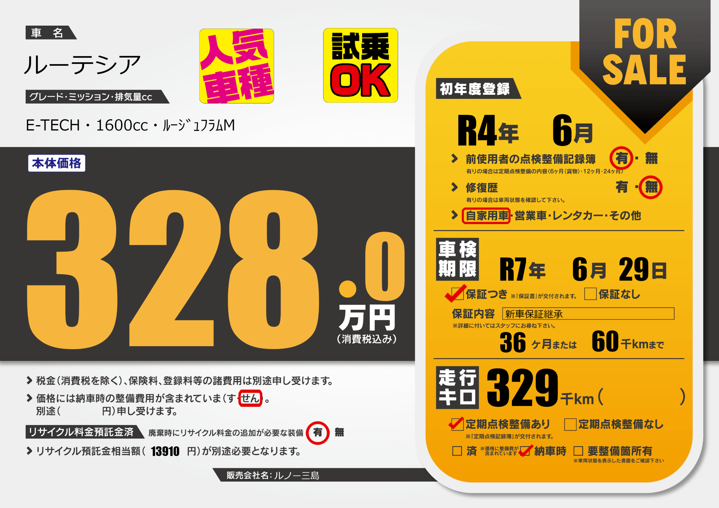 | 定期点検整備 | 定期点検整備あり 納車時あり | ||