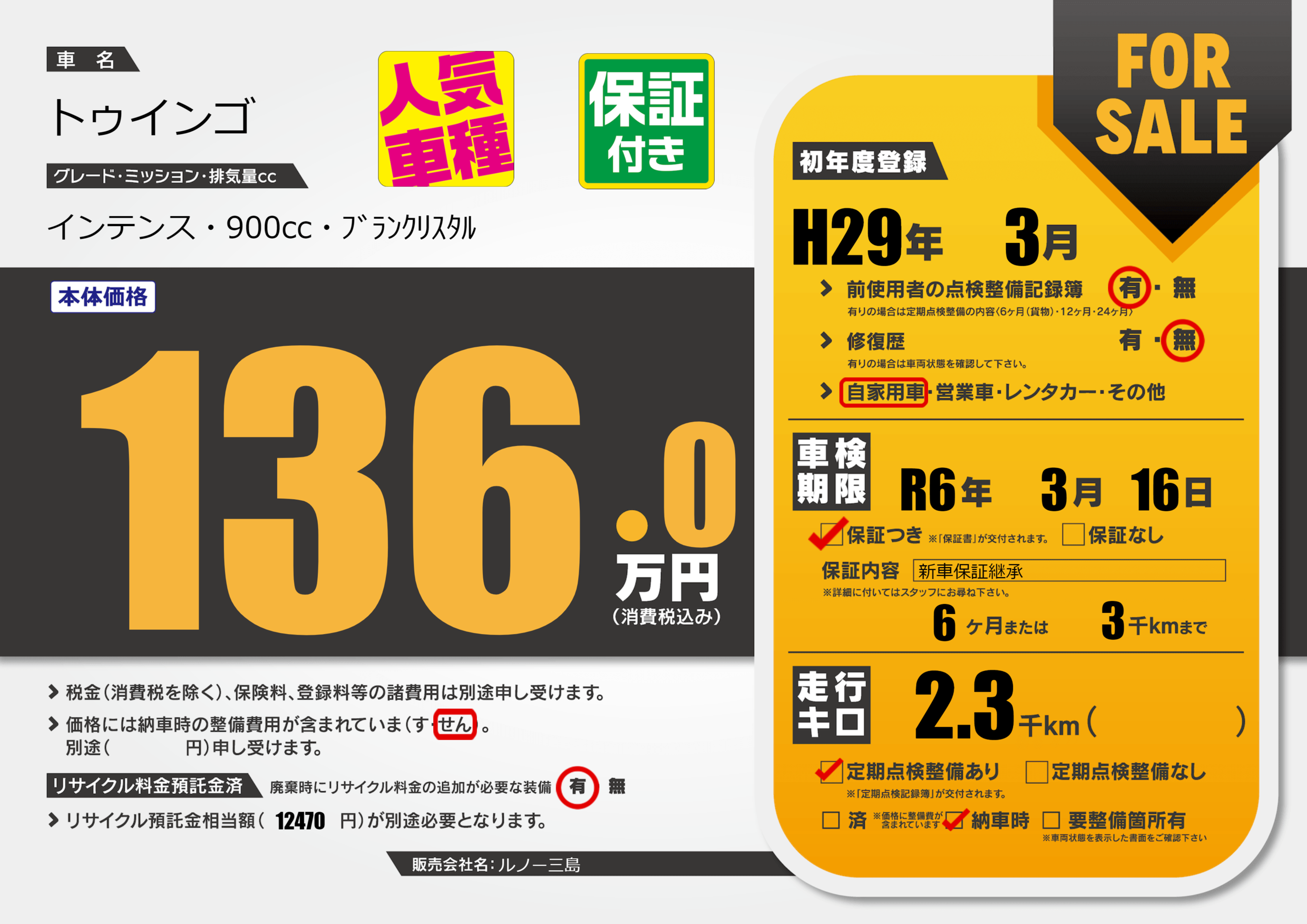 | 車名 | トゥインゴ | グレード ミッション 排気量 |