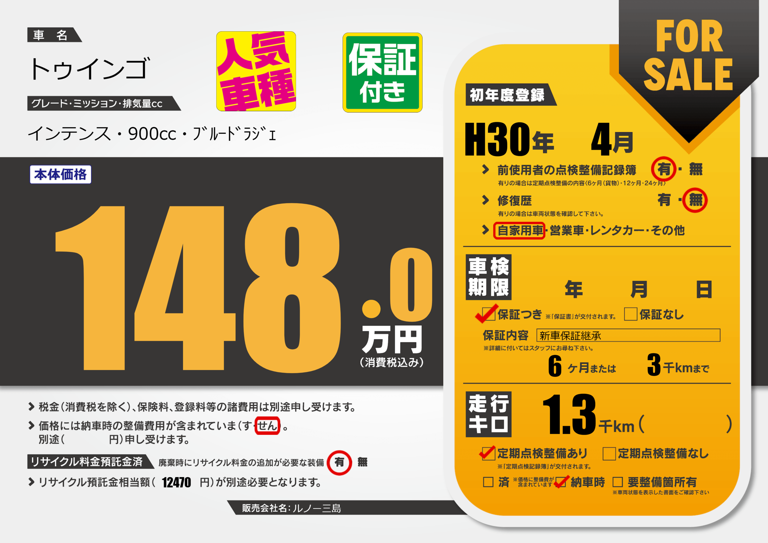 | 車名 | トゥインゴ | グレード ミッション 排気量 |