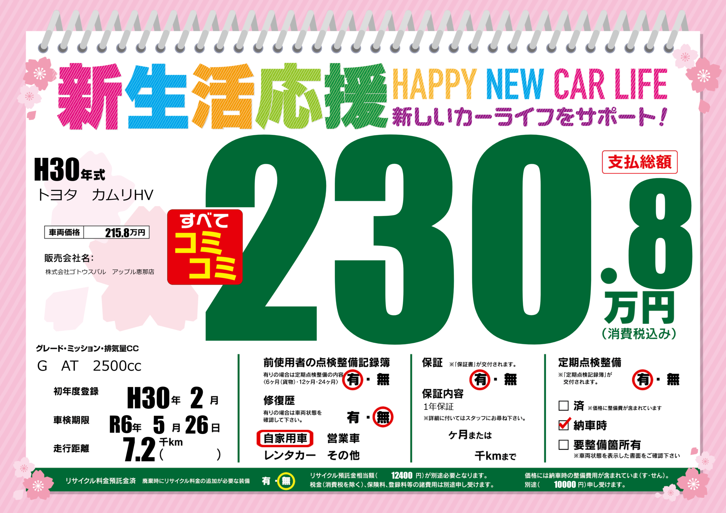 | 車名 | トヨタ カムリHV | グレード ミッション 排気量 |