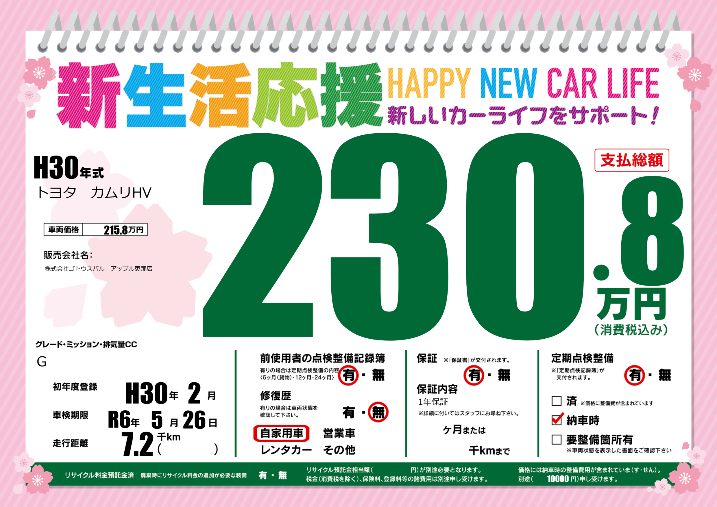 | 車名 | トヨタ カムリHV | グレード ミッション 排気量 |