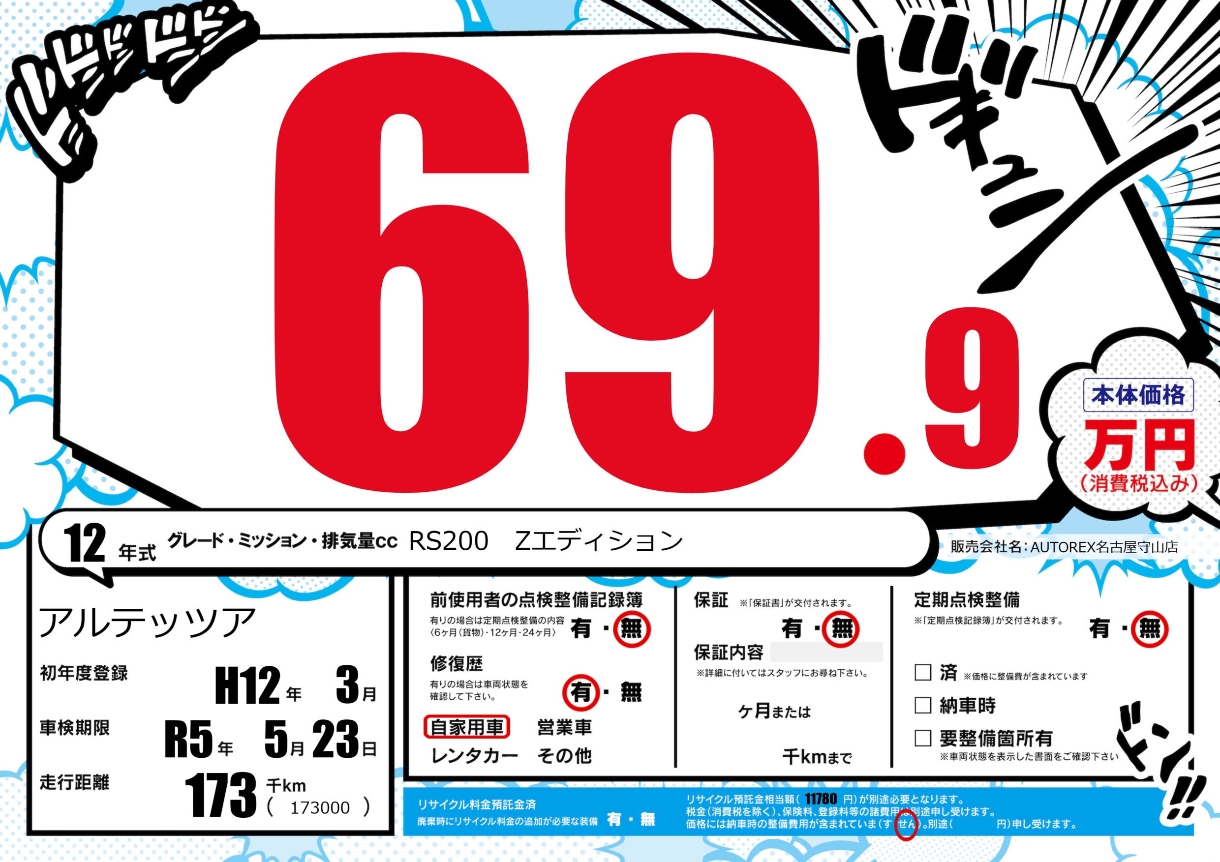 | 車名 | アルテッツア | グレード ミッション 排気量 |