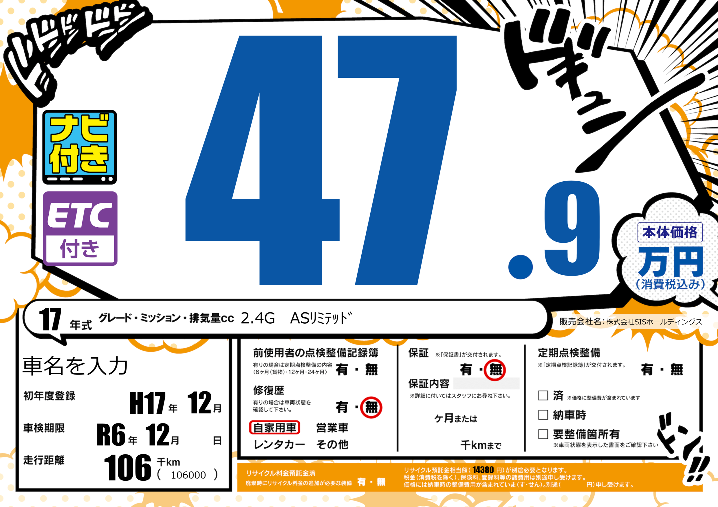 | 走行キロ | 10.6万km | 初年度登録 | H17年12月 |