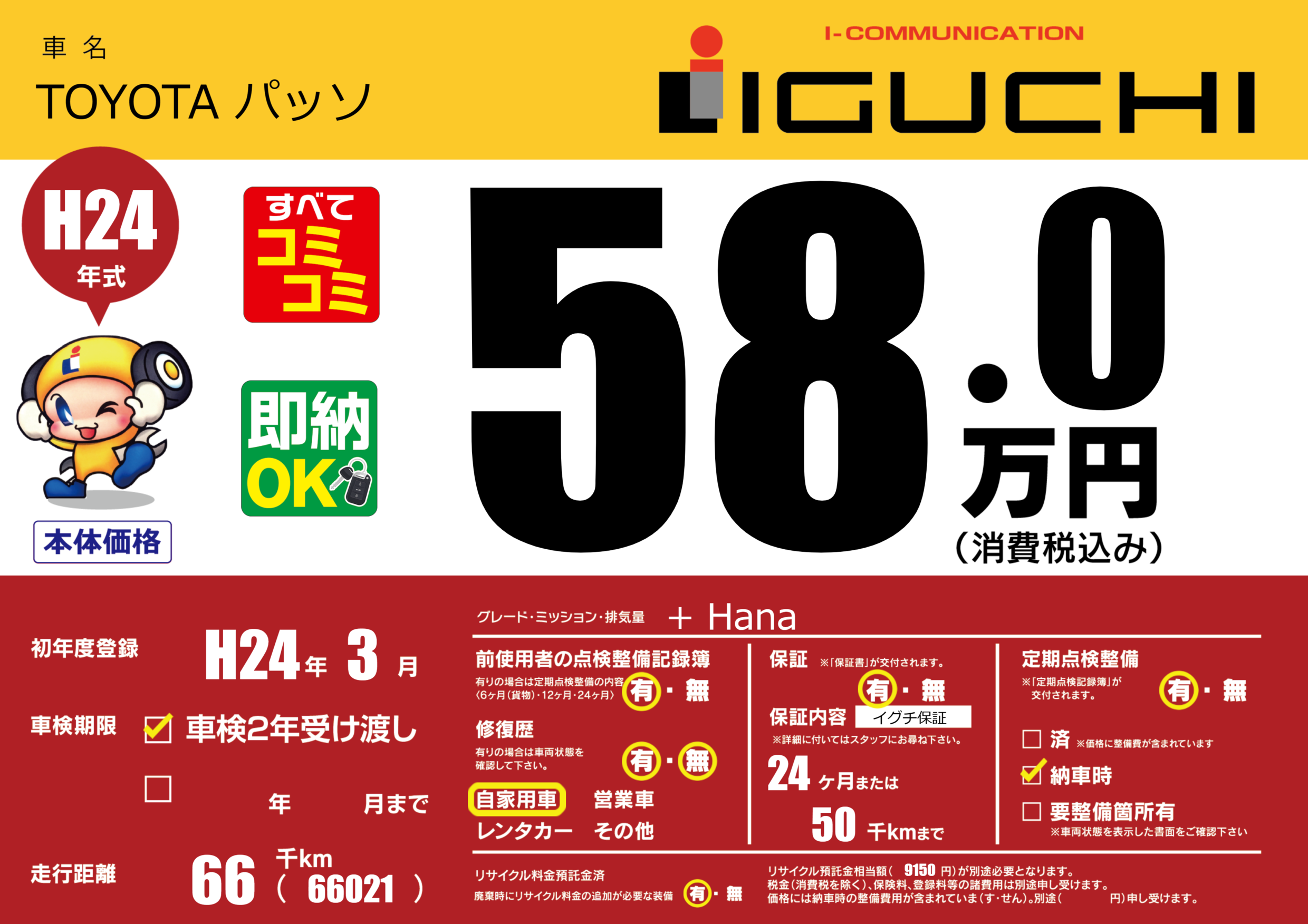 | 車名 | TOYOTA パッソ | グレード ミッション 排気量 |