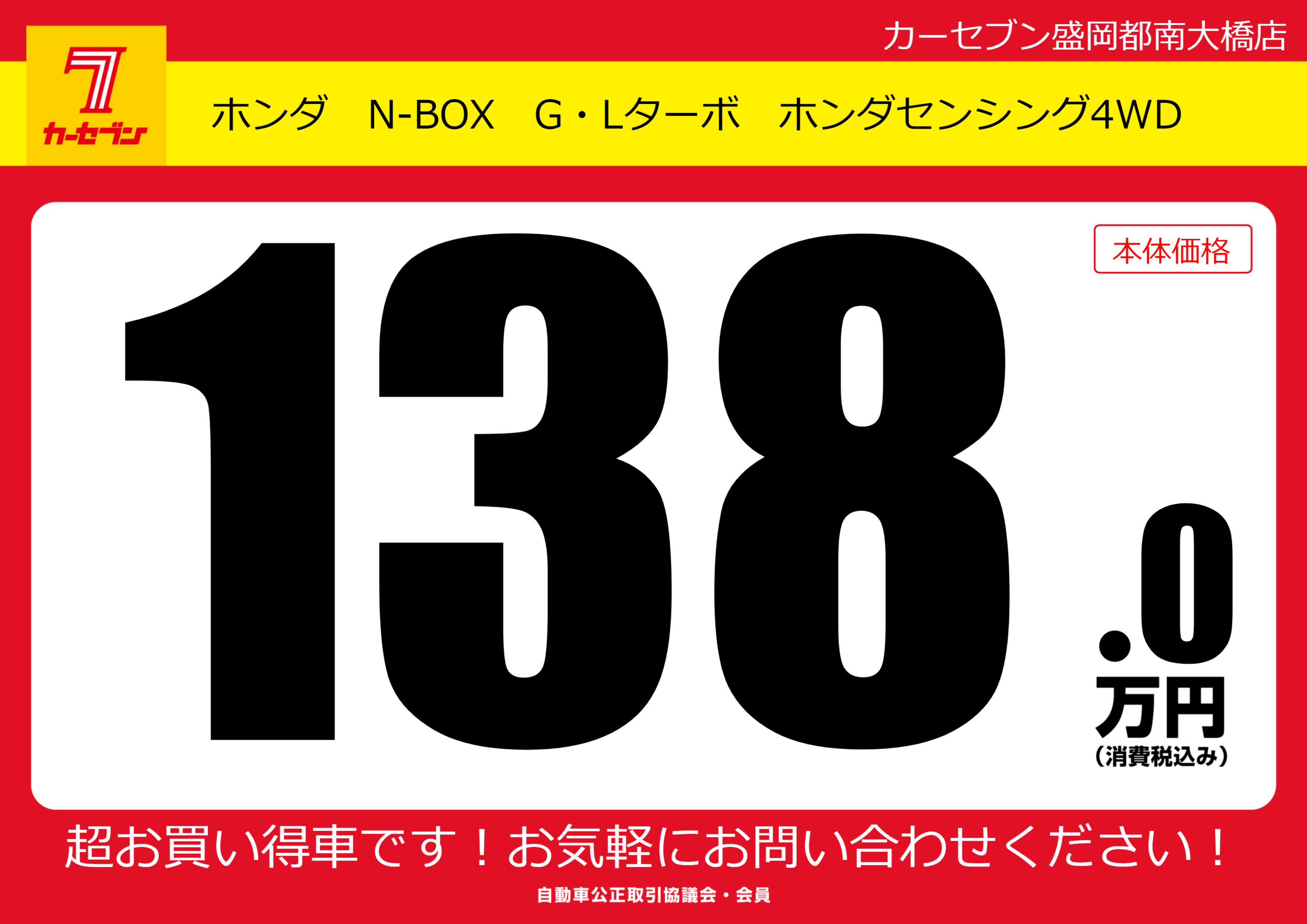 | 車名 | ホンダ N-BOX G・Lターボ ホンダセンシング4WD | グレード ミッション 排気量 |