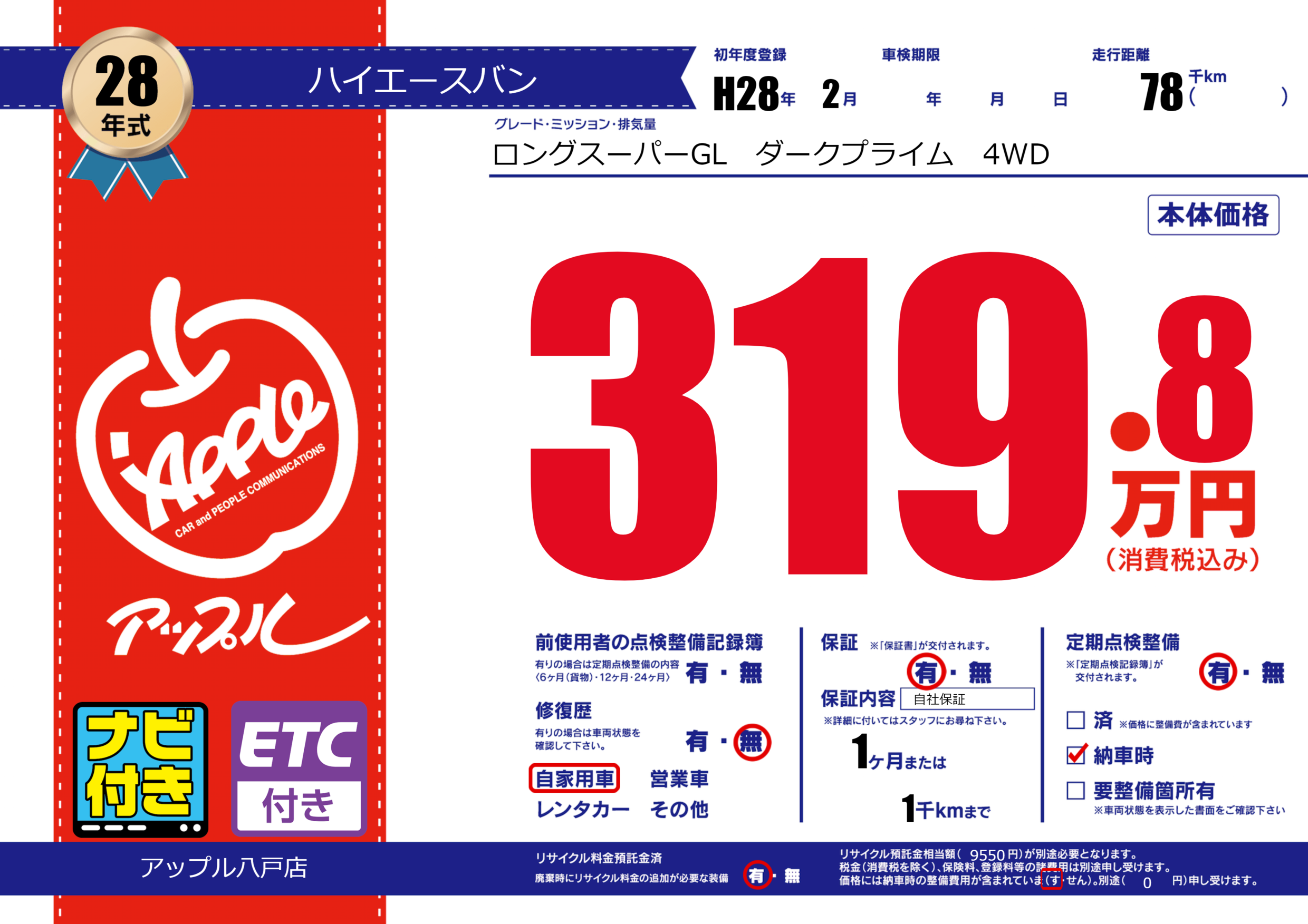 | 走行キロ | 7.8万km | 初年度登録 | H28年2月 |