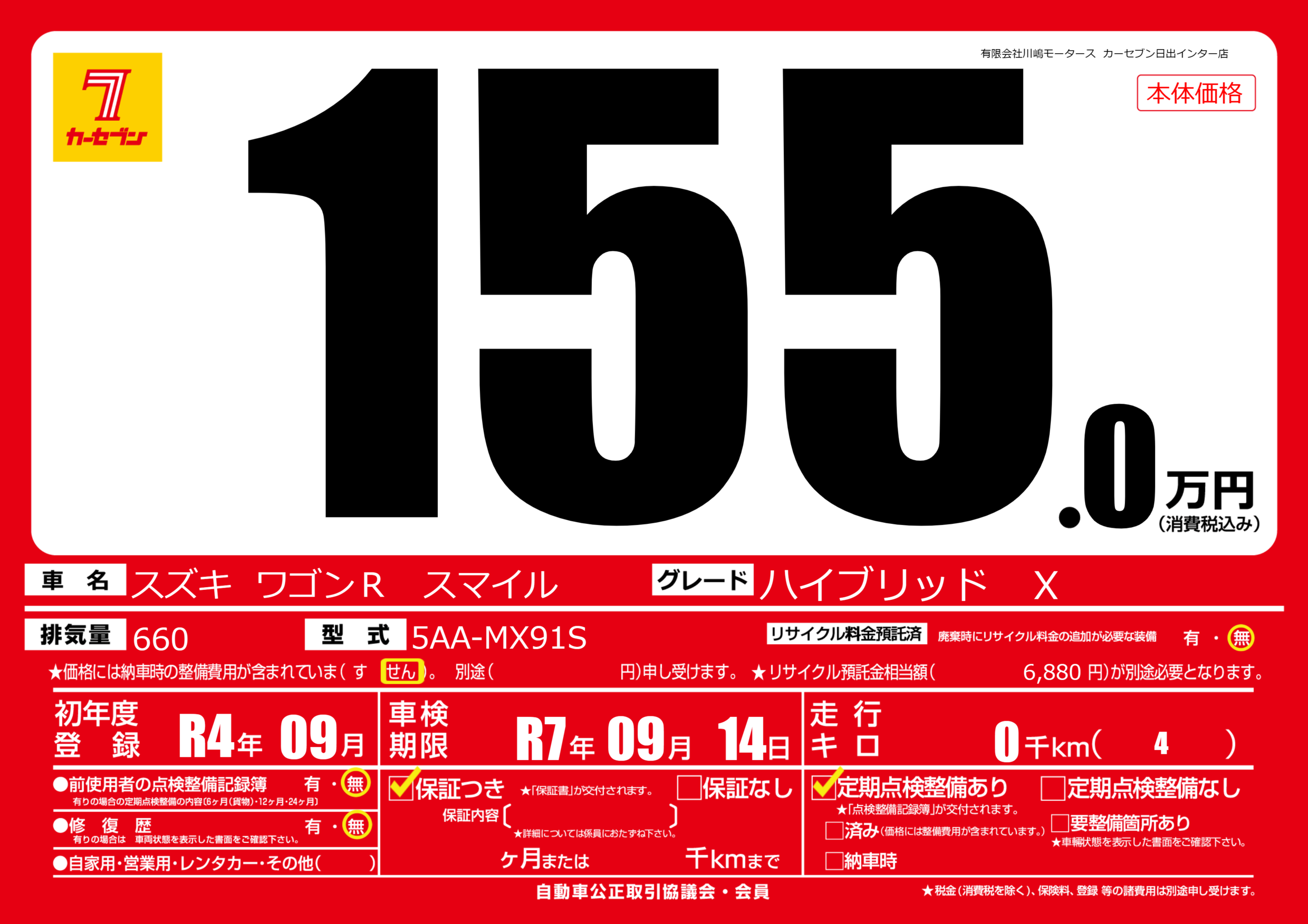 | 車名 | スズキ ワゴンR スマイル | グレード ミッション 排気量 |
