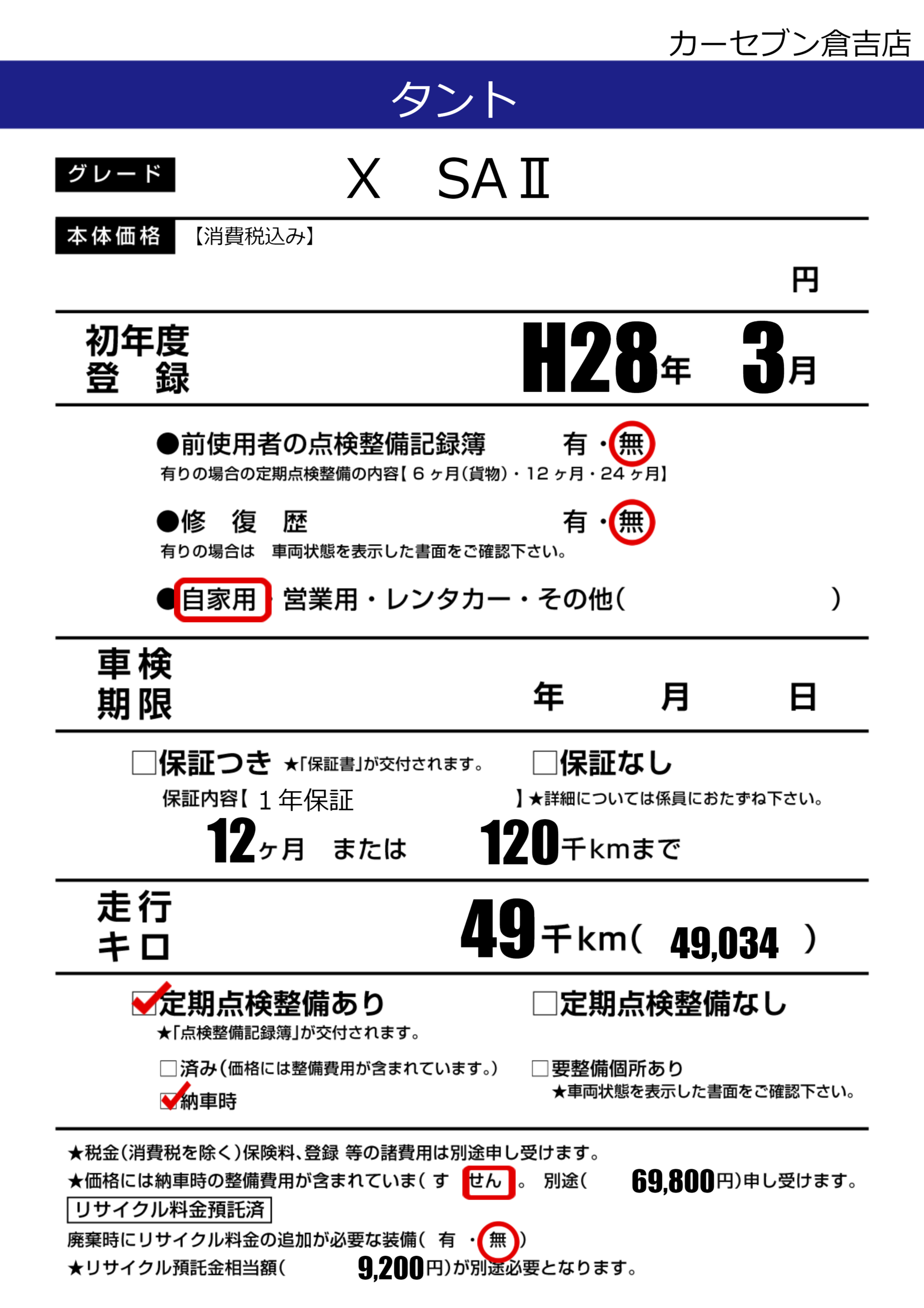 | 定期点検整備 | 定期点検整備あり 納車時あり | ||