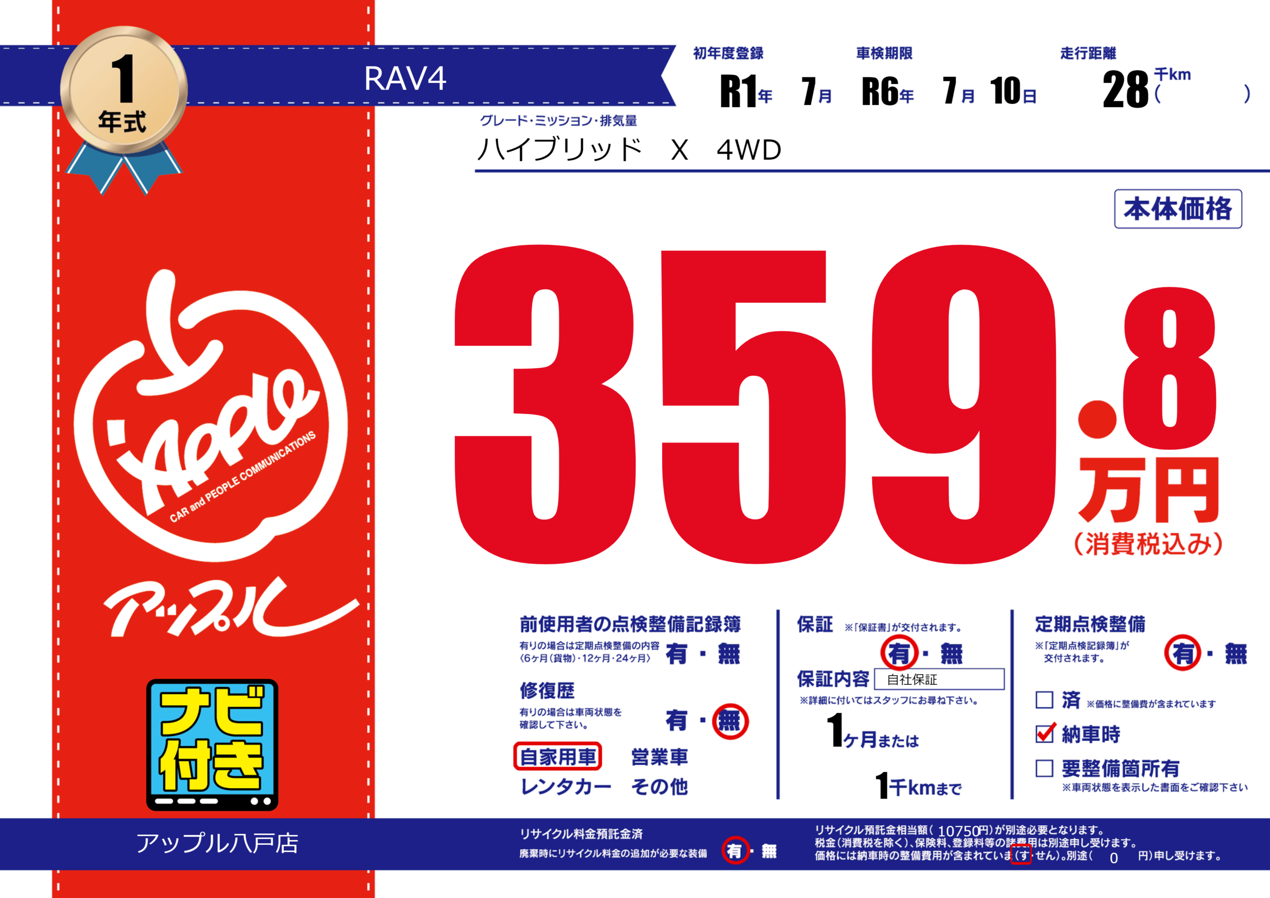 保証付き 保証内容( 自社保証) 1ヶ月または(1)千kmまで |