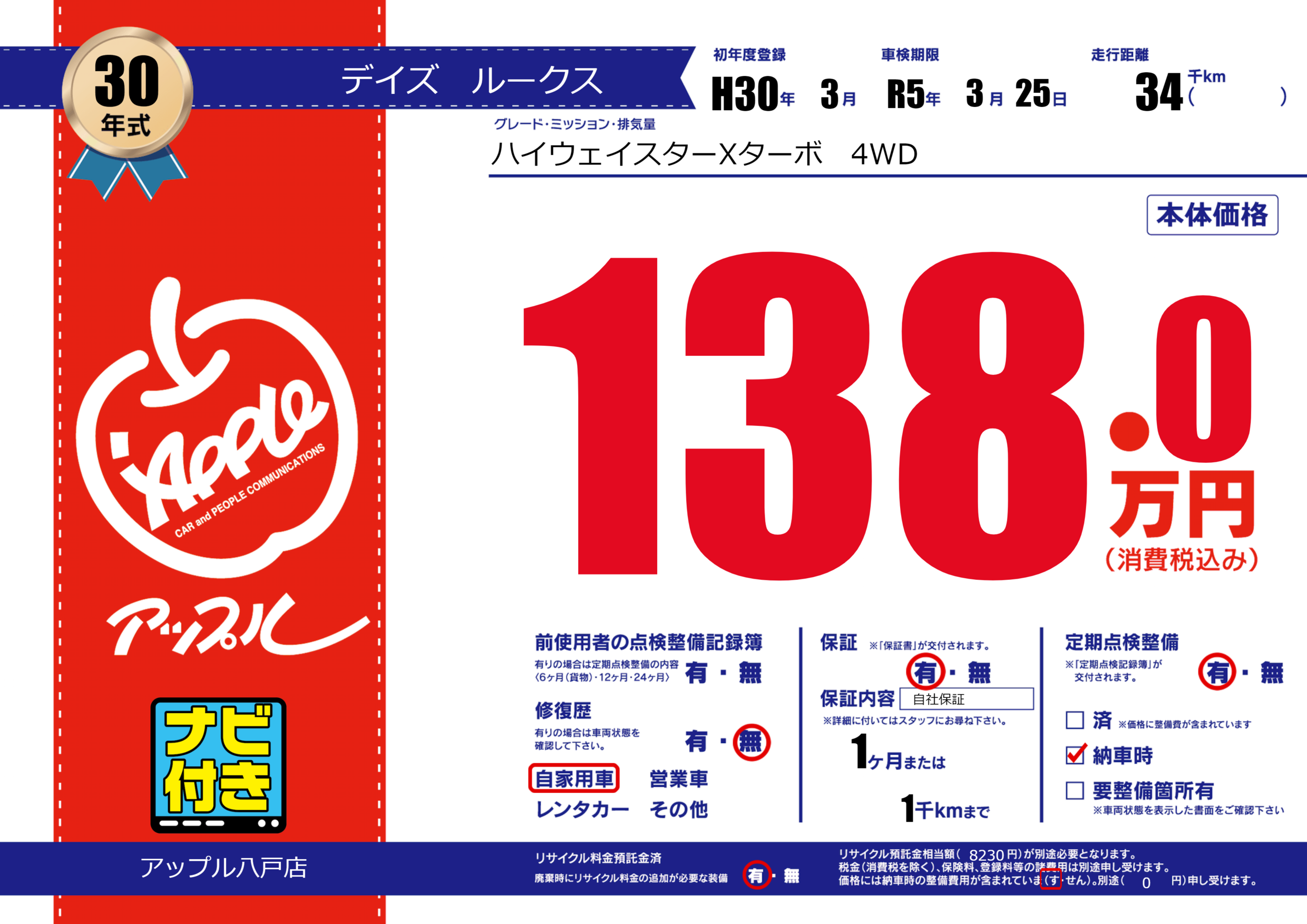 | 走行キロ | 3.4万km | 初年度登録 | H30年3月 |