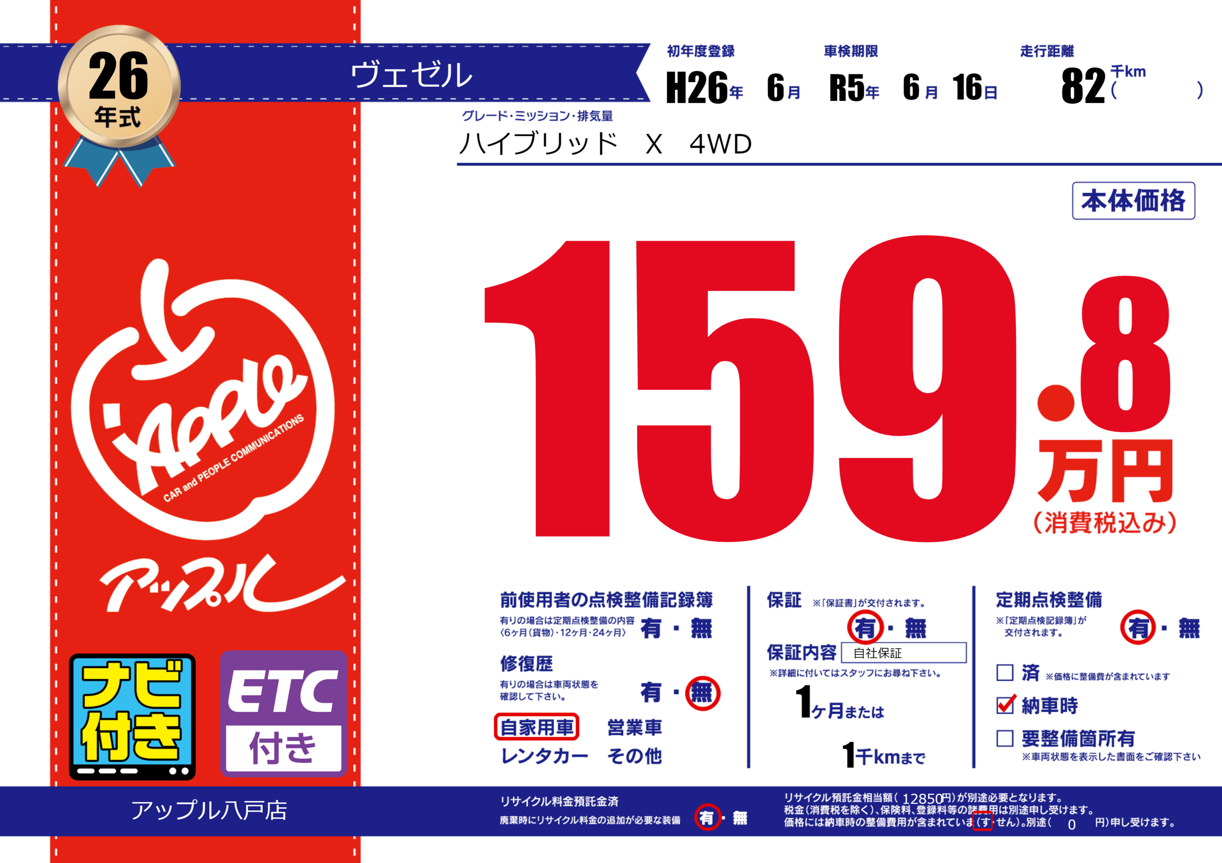 保証付き 保証内容( 自社保証) 1ヶ月または(1)千kmまで |