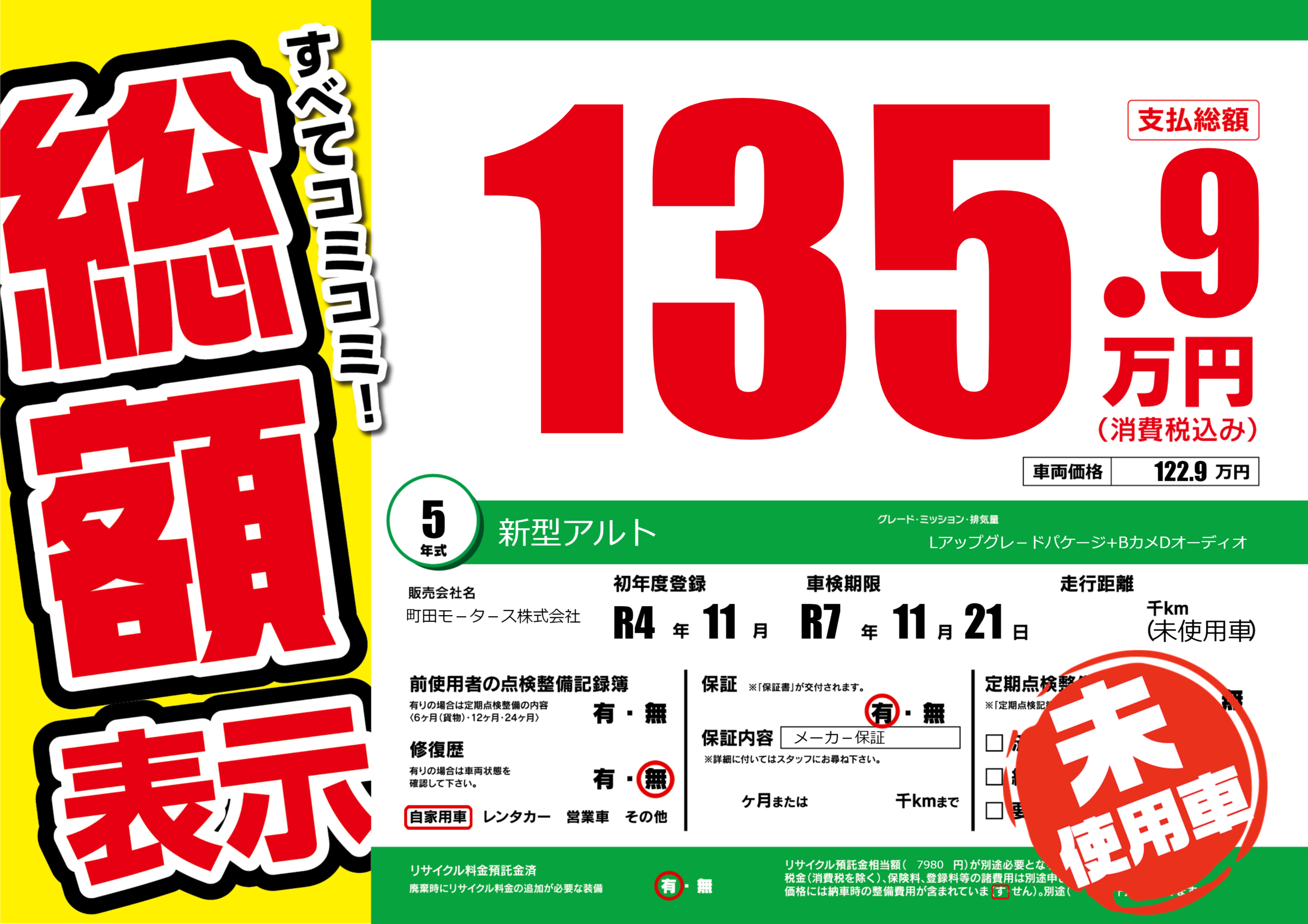 | 車名 | 新型アルト | グレード ミッション 排気量 |