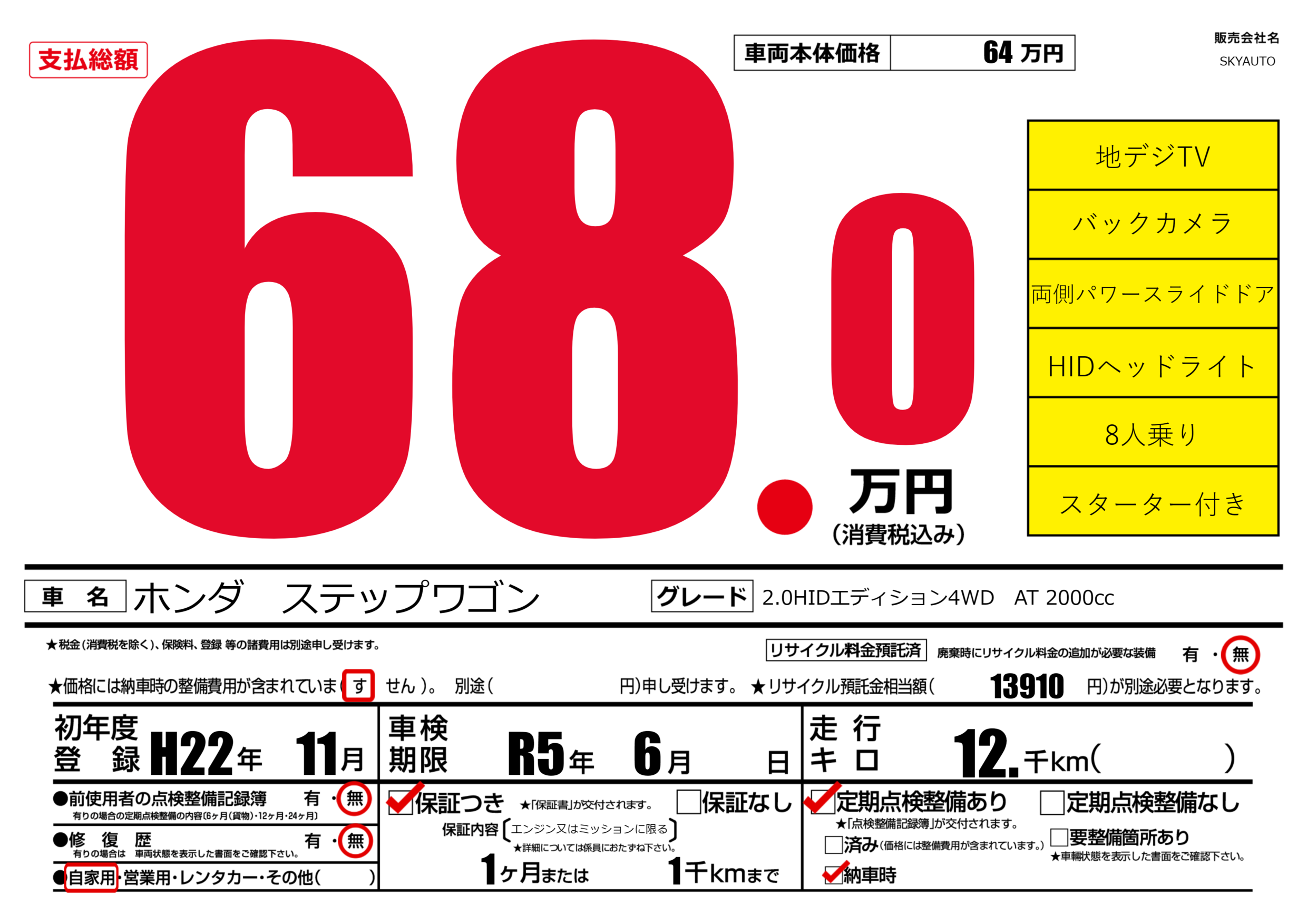 | 定期点検整備 | 定期点検整備あり 納車時あり | ||
