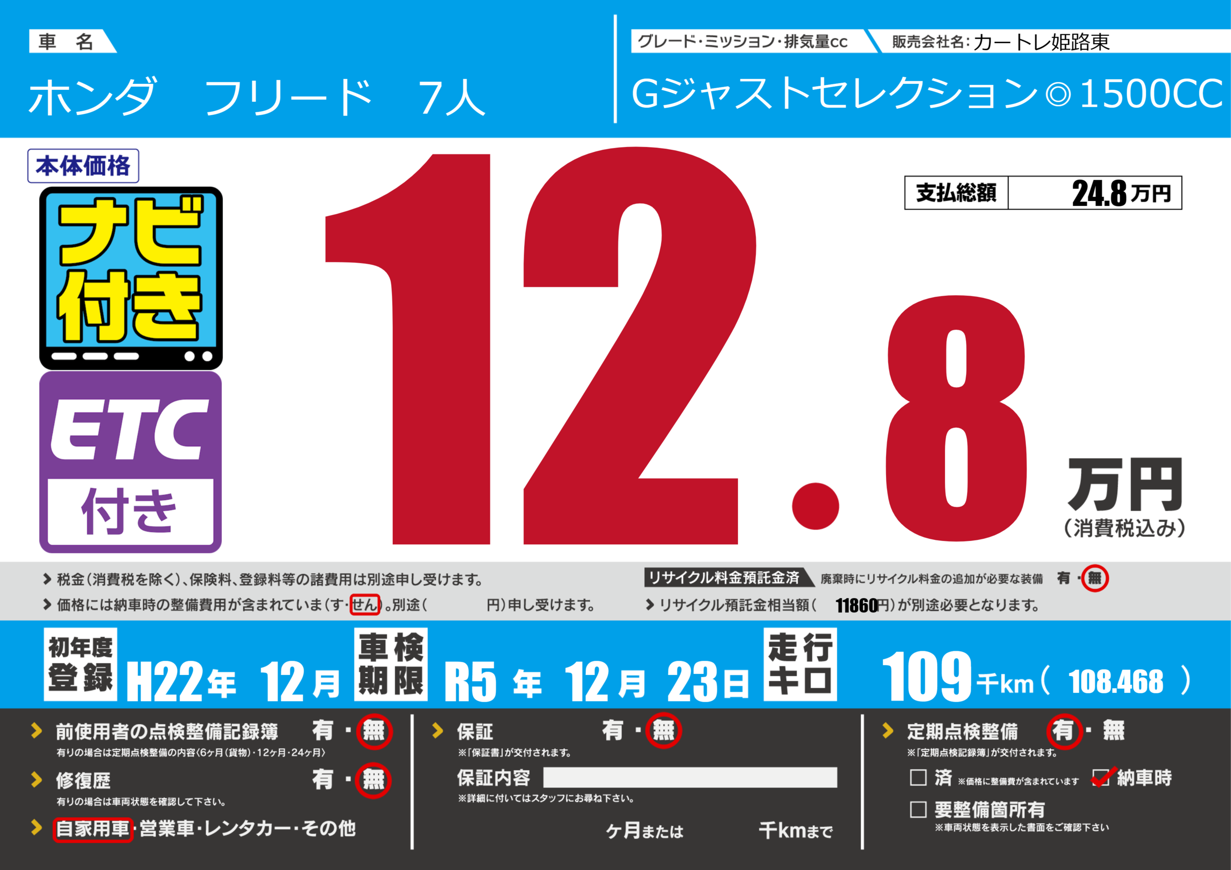 | 走行キロ | 10.9万km | 初年度登録 | H22年12月 |