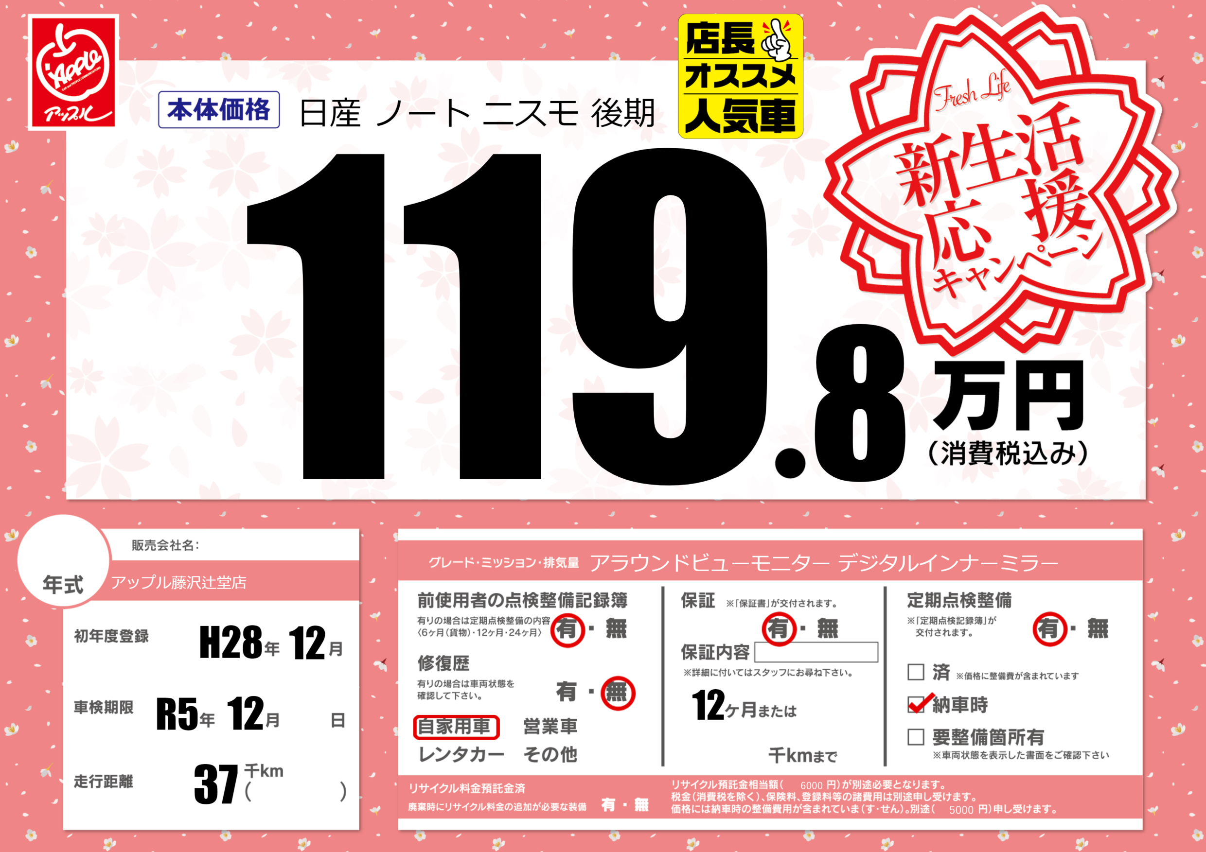 | 定期点検整備 | 定期点検整備あり 納車時あり | ||