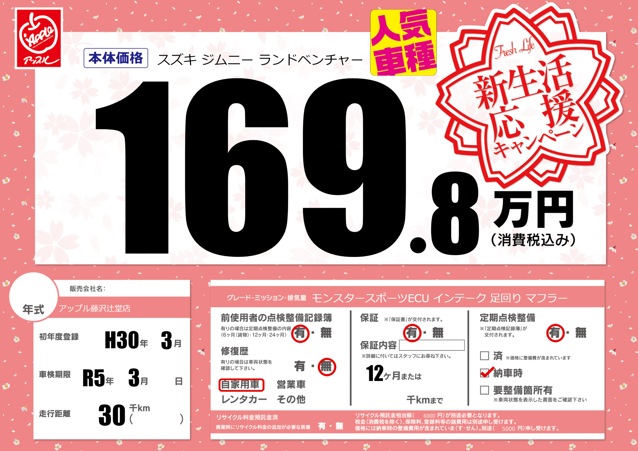 | 走行キロ | 3万km | 初年度登録 | H30年3月 |