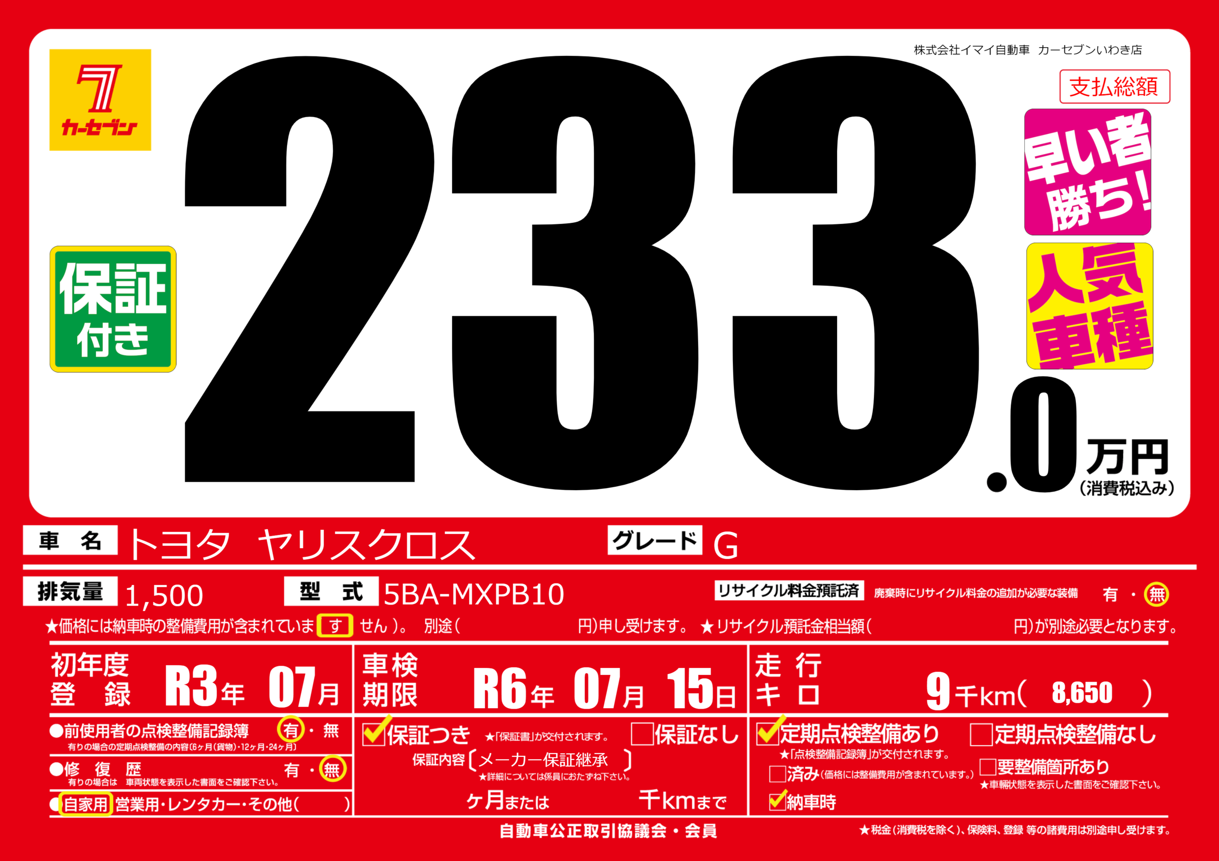 | 車名 | トヨタ ヤリスクロス | グレード ミッション 排気量 |