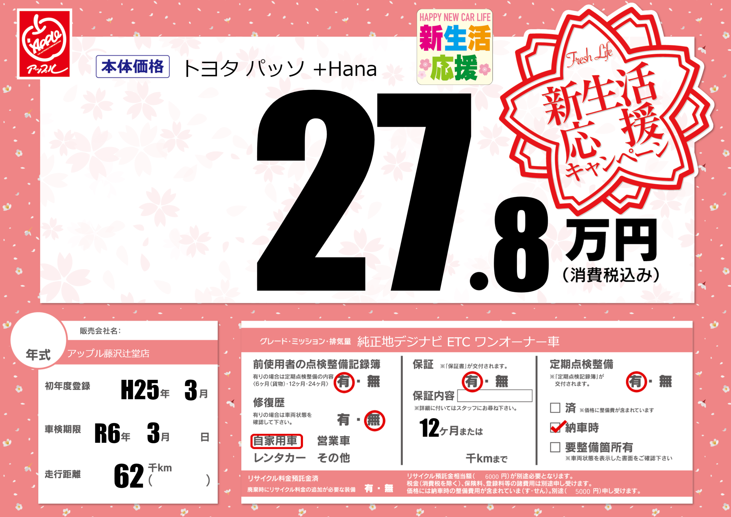 | 車名 | トヨタ パッソ +Hana | グレード ミッション 排気量 |