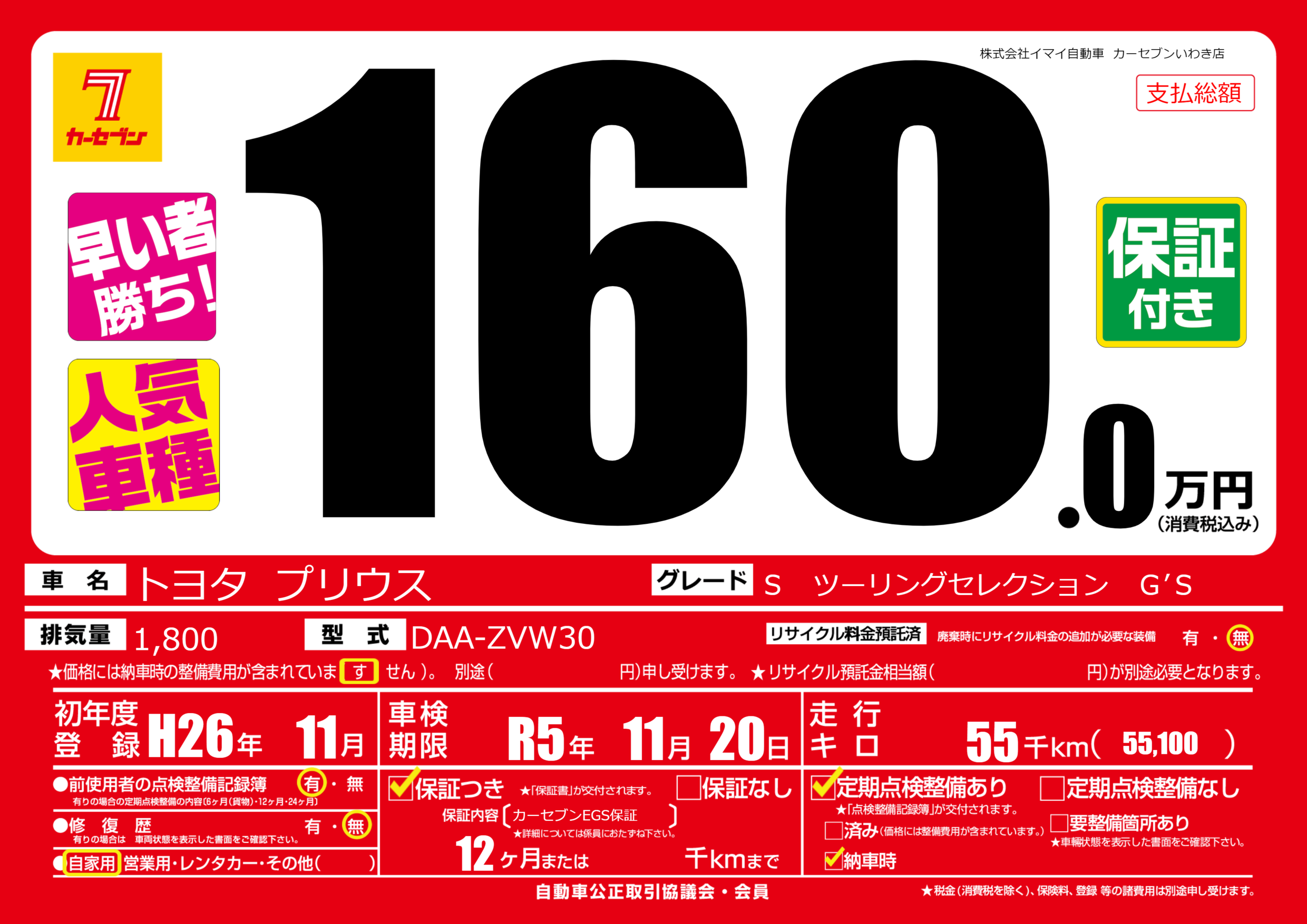 | 車名 | トヨタ プリウス | グレード ミッション 排気量 |
