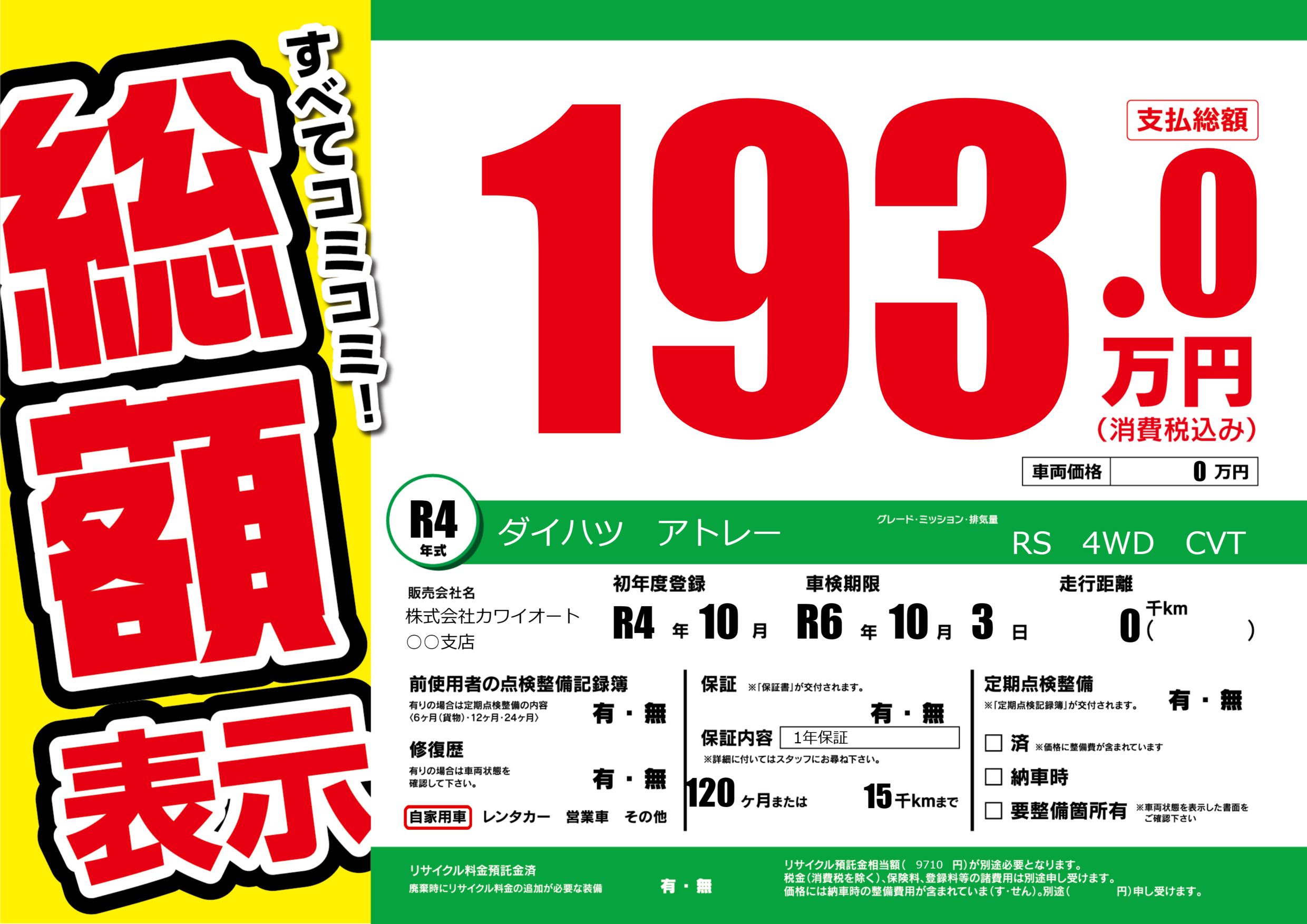 保証なし 保証内容(1年保証) 120ヶ月または(15)千kmまで |