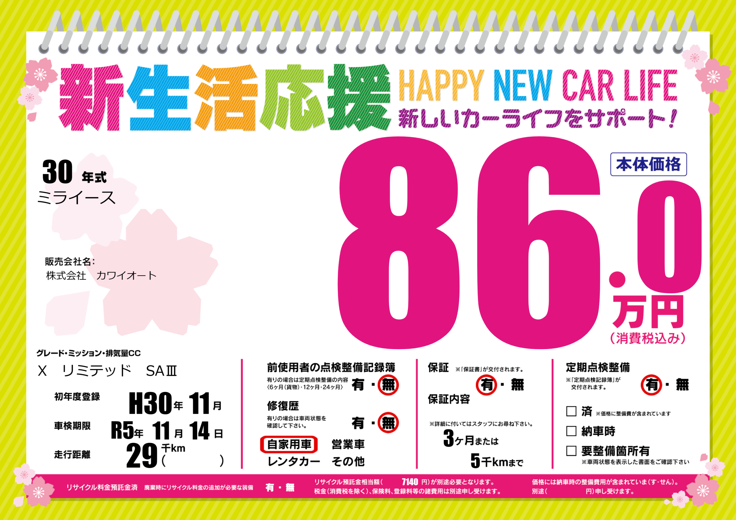 | 走行キロ | 2.9万km | 初年度登録 | H30年11月 |