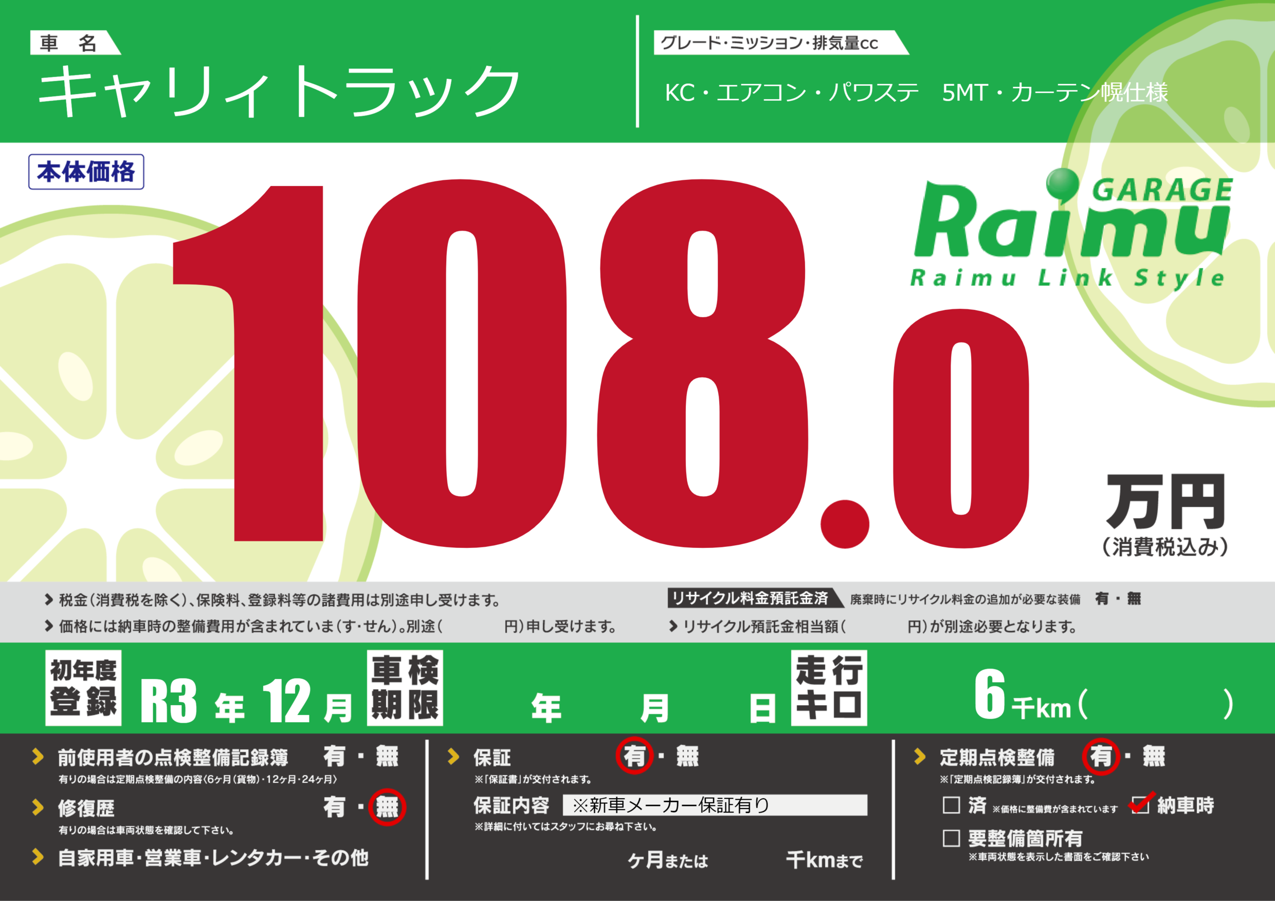 保証付き 保証内容(※新車メーカー保証有り) ヶ月または千km |