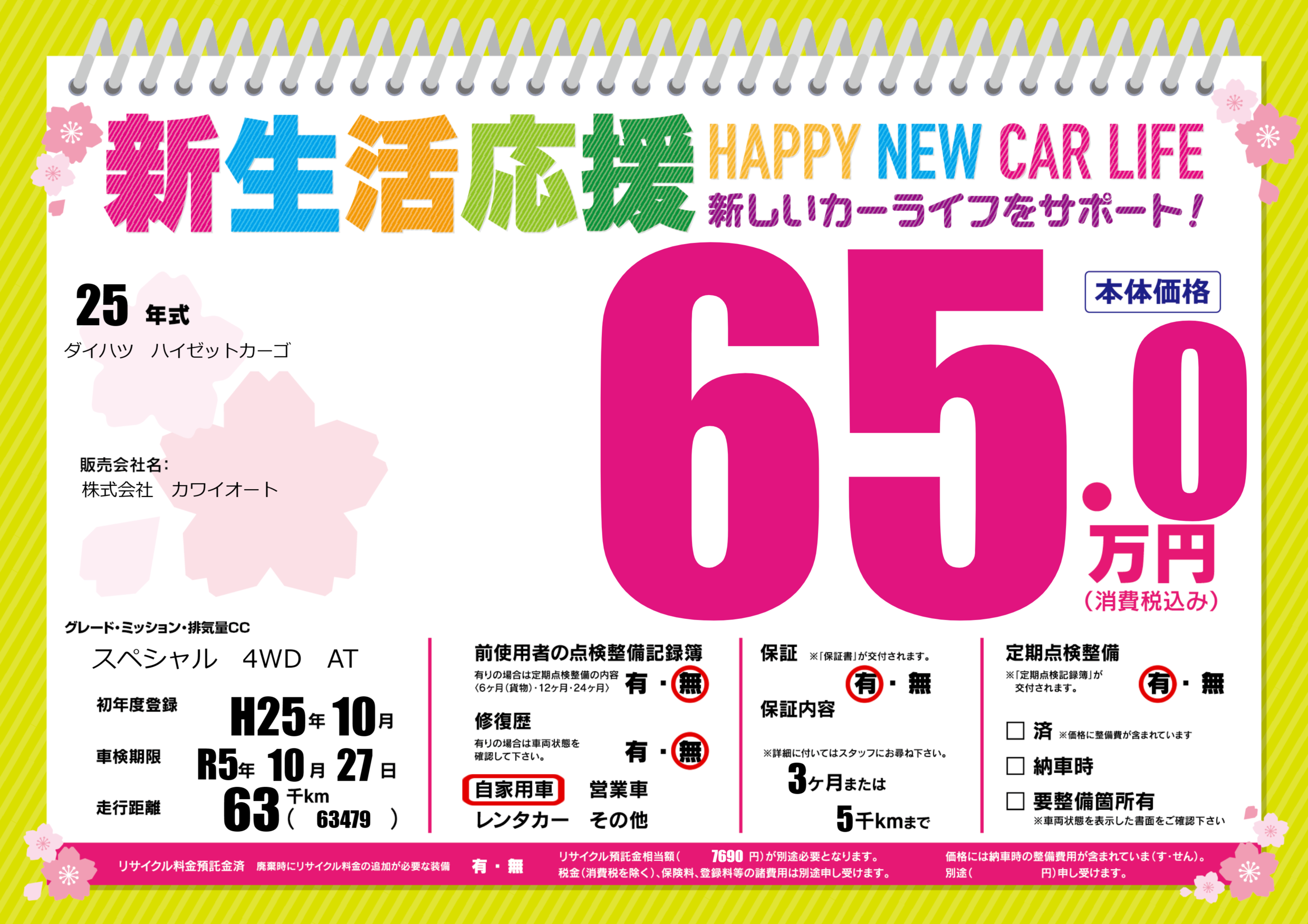 | 車名 | ダイハツ ハイゼットカーゴ | グレード ミッション 排気量 |