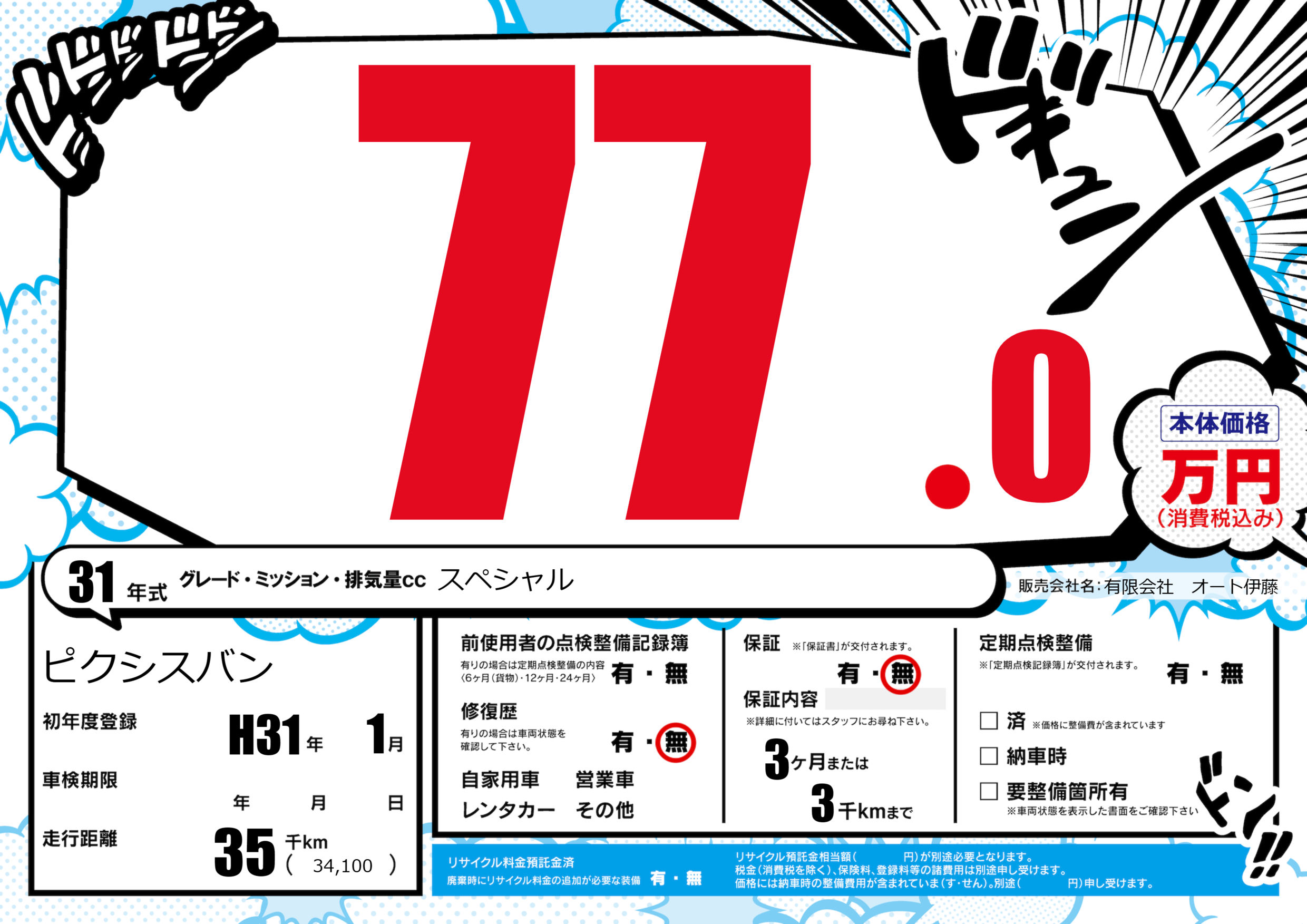 | 走行キロ | 3.5万km | 初年度登録 | H31年1月 |