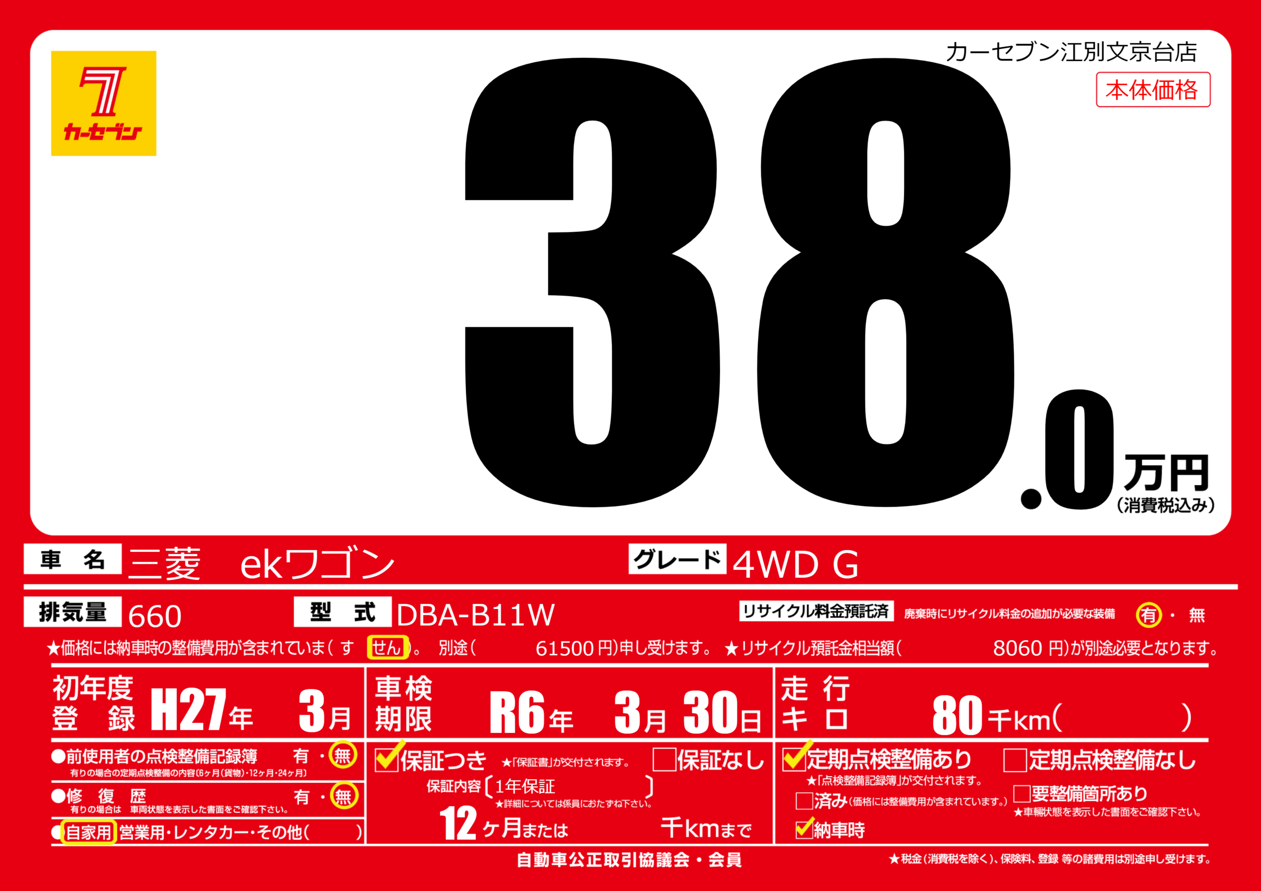 | 車名 | 三菱 ekワゴン | グレード ミッション 排気量 |