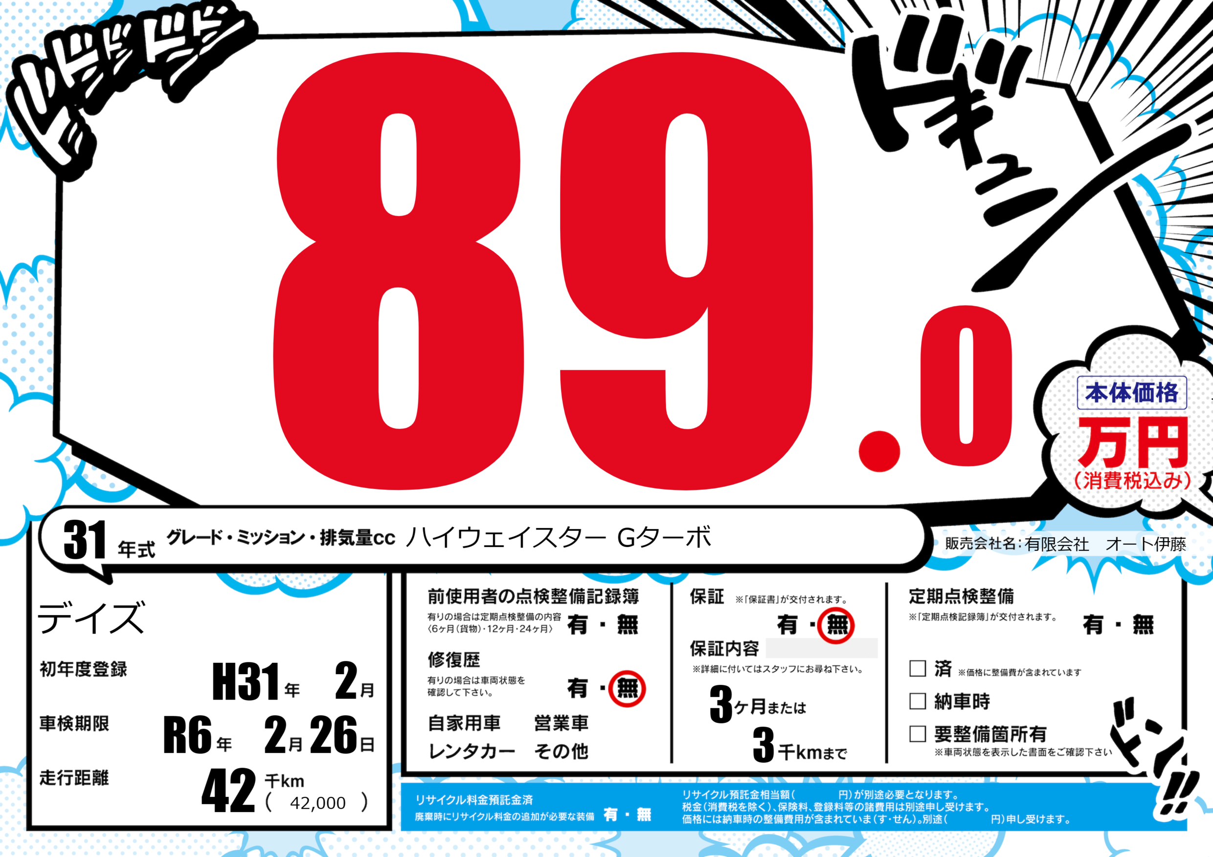 | 走行キロ | 4.2万km | 初年度登録 | H31年2月 |