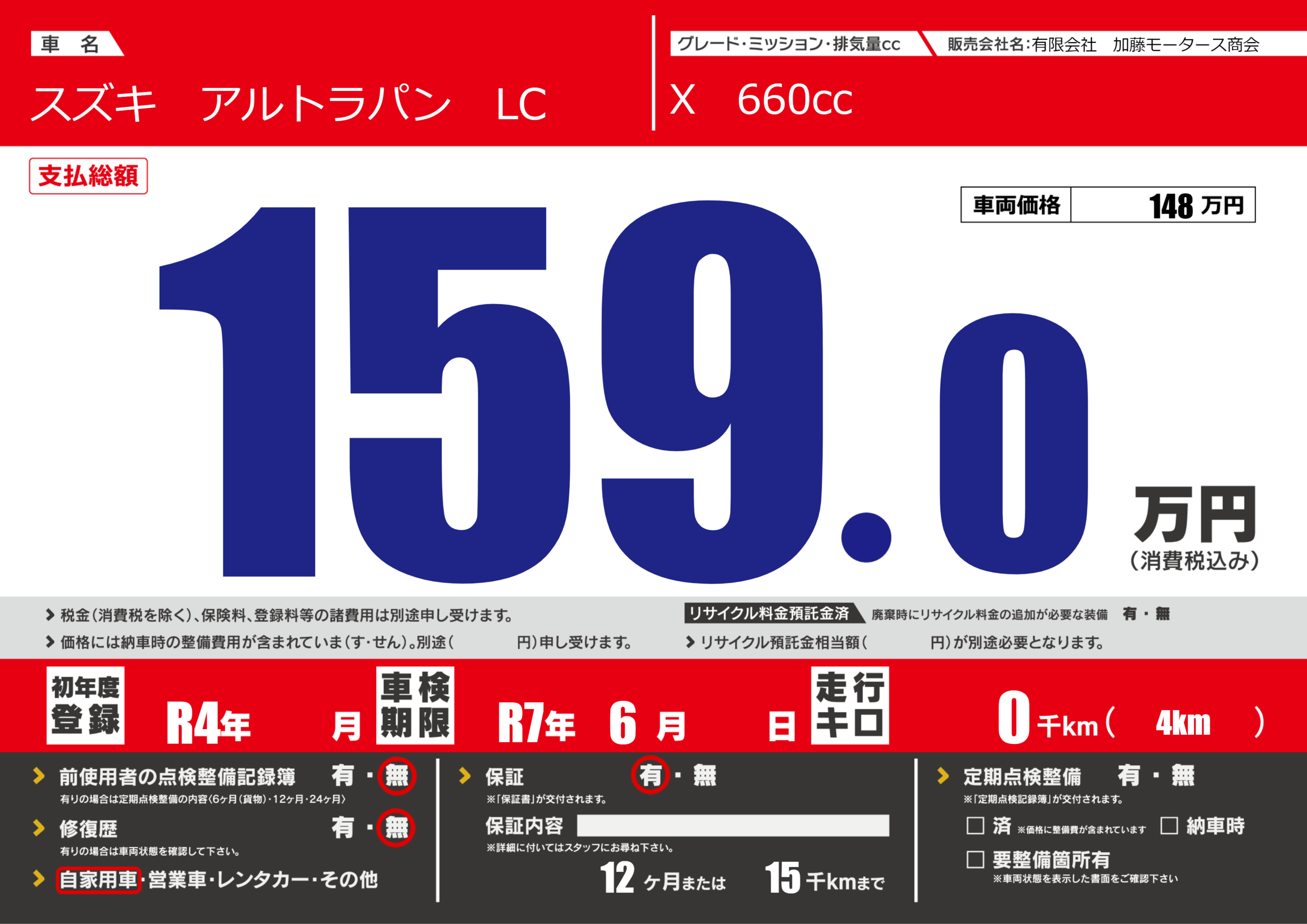 | 走行キロ | - | 初年度登録 | R4年---月 |
