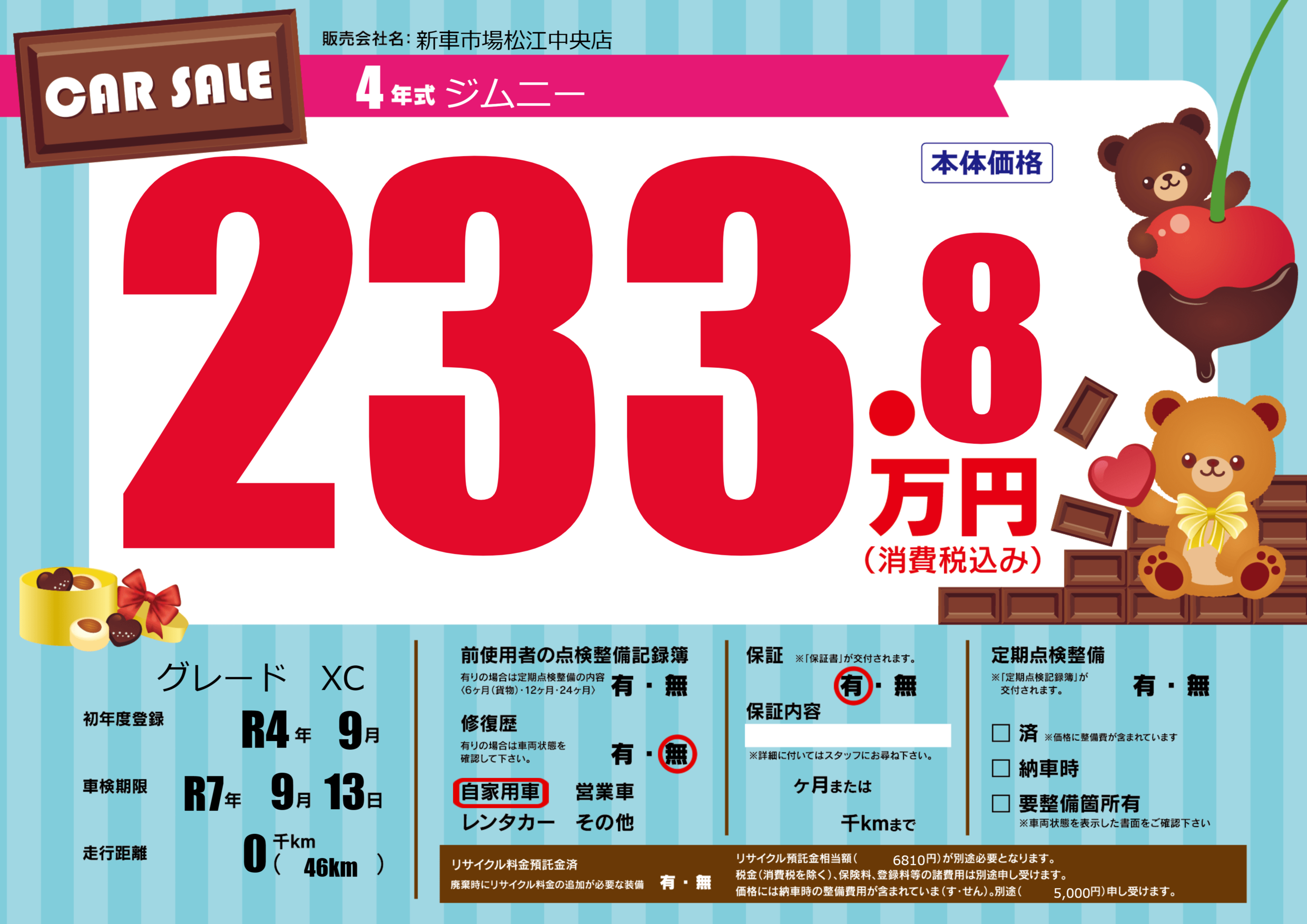 | 車名 | ジムニー | グレード ミッション 排気量 |