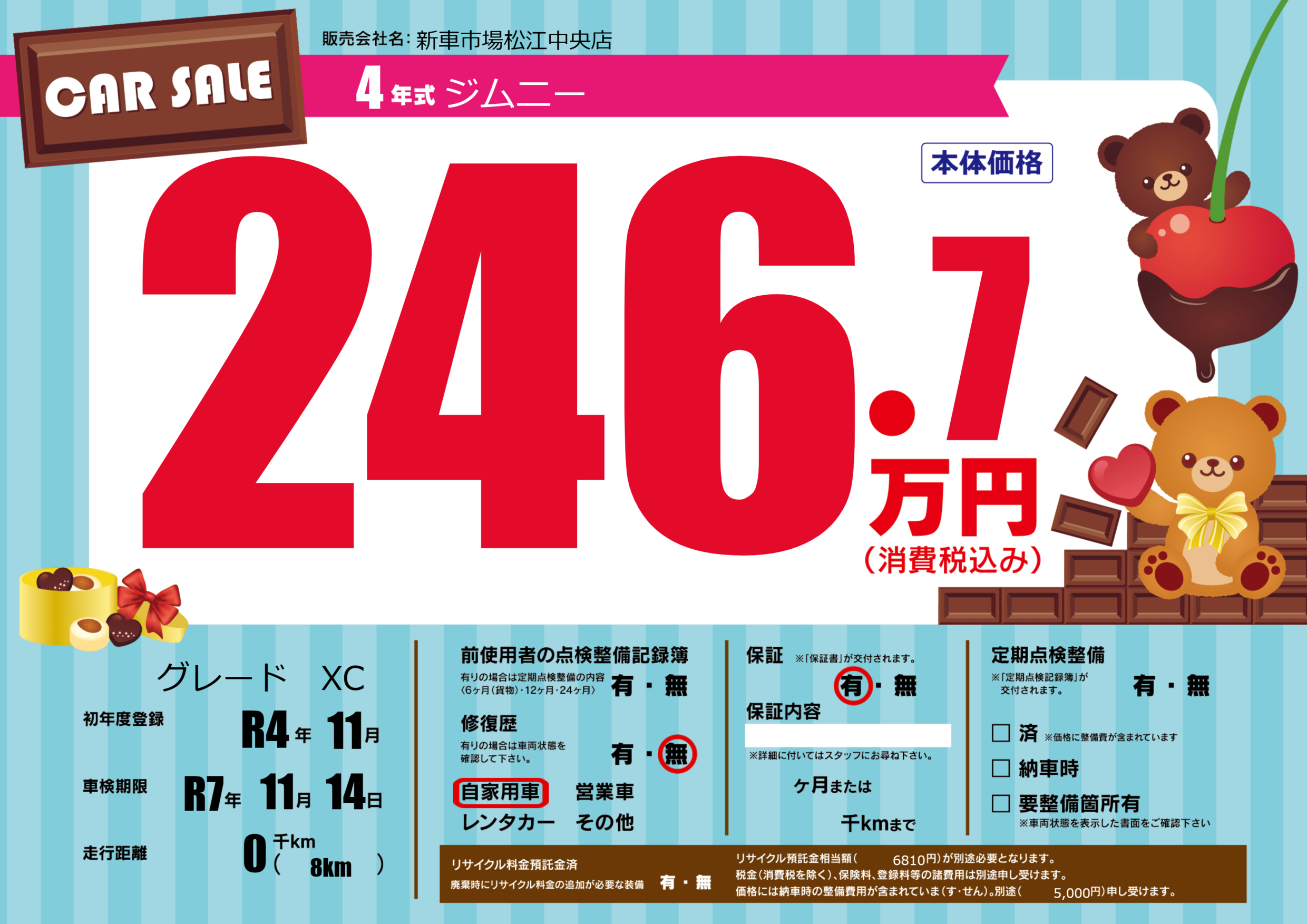 | 車名 | ジムニー | グレード ミッション 排気量 |