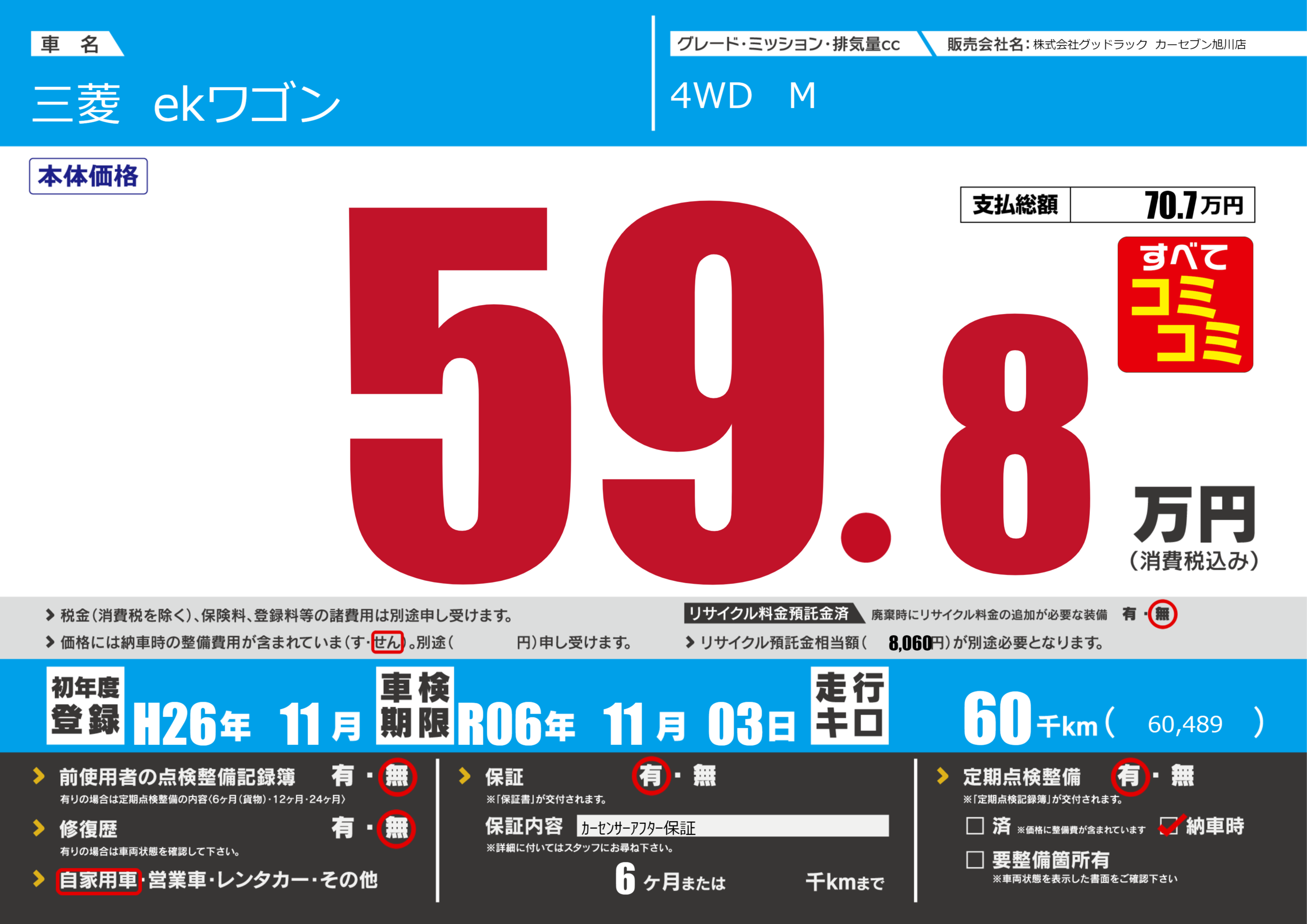 | 走行キロ | 6万km | 初年度登録 | H26年11月 |