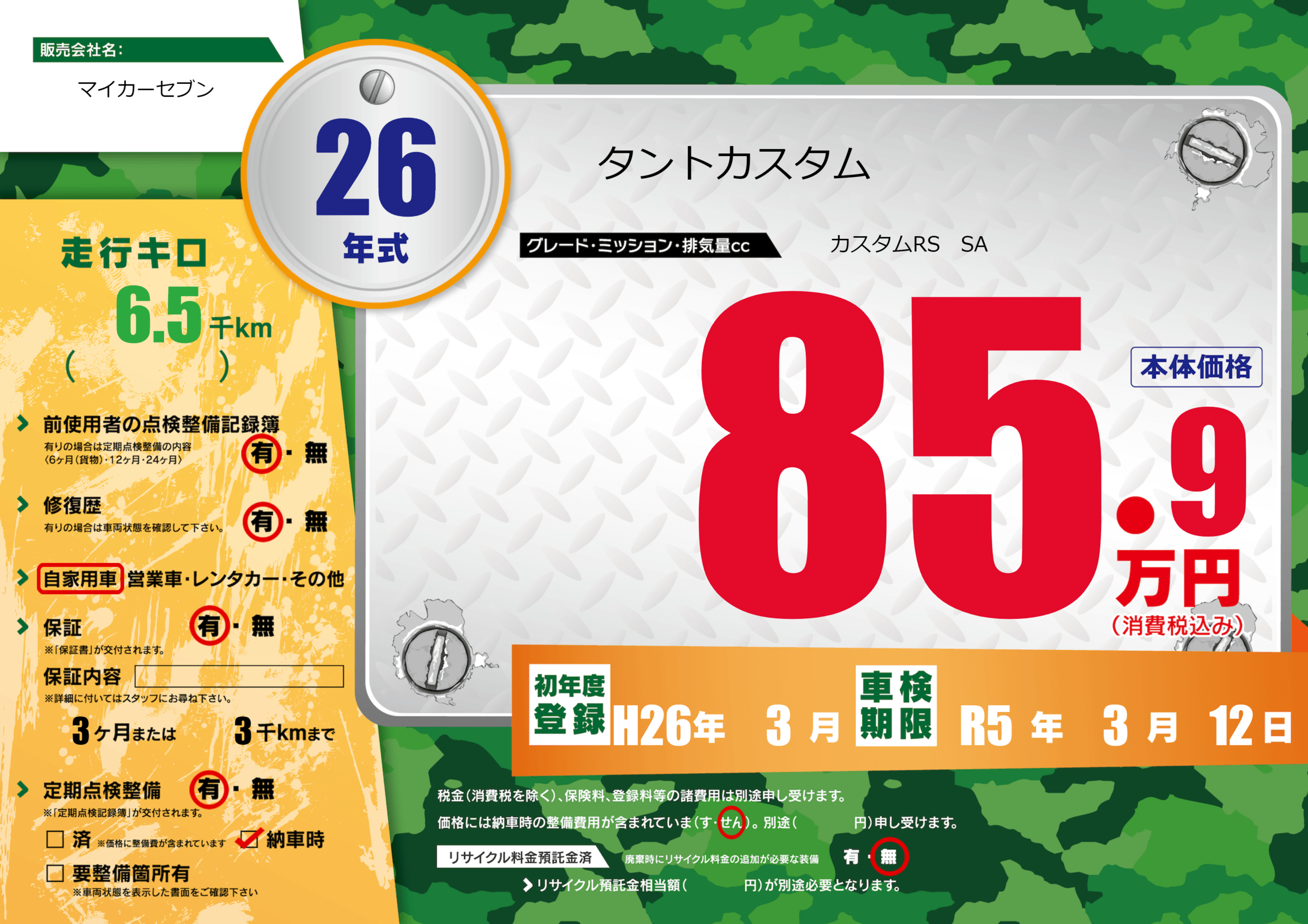 | 車名 | タントカスタム | グレード ミッション 排気量 |