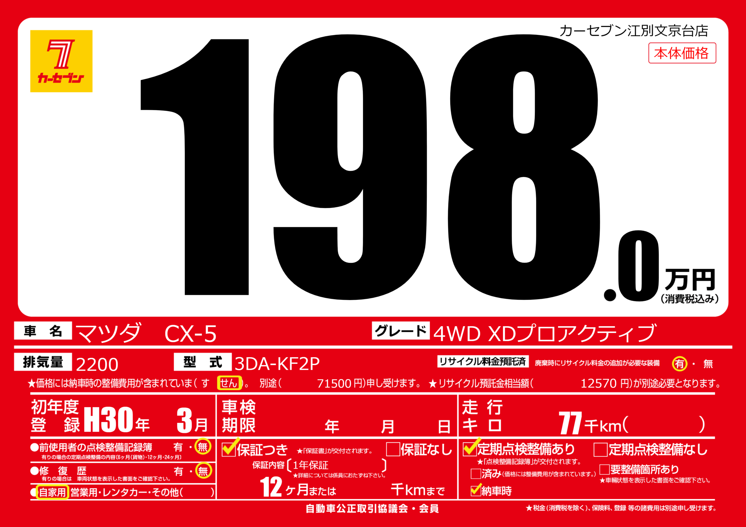 | 走行キロ | 7.7万km | 初年度登録 | H30年3月 |