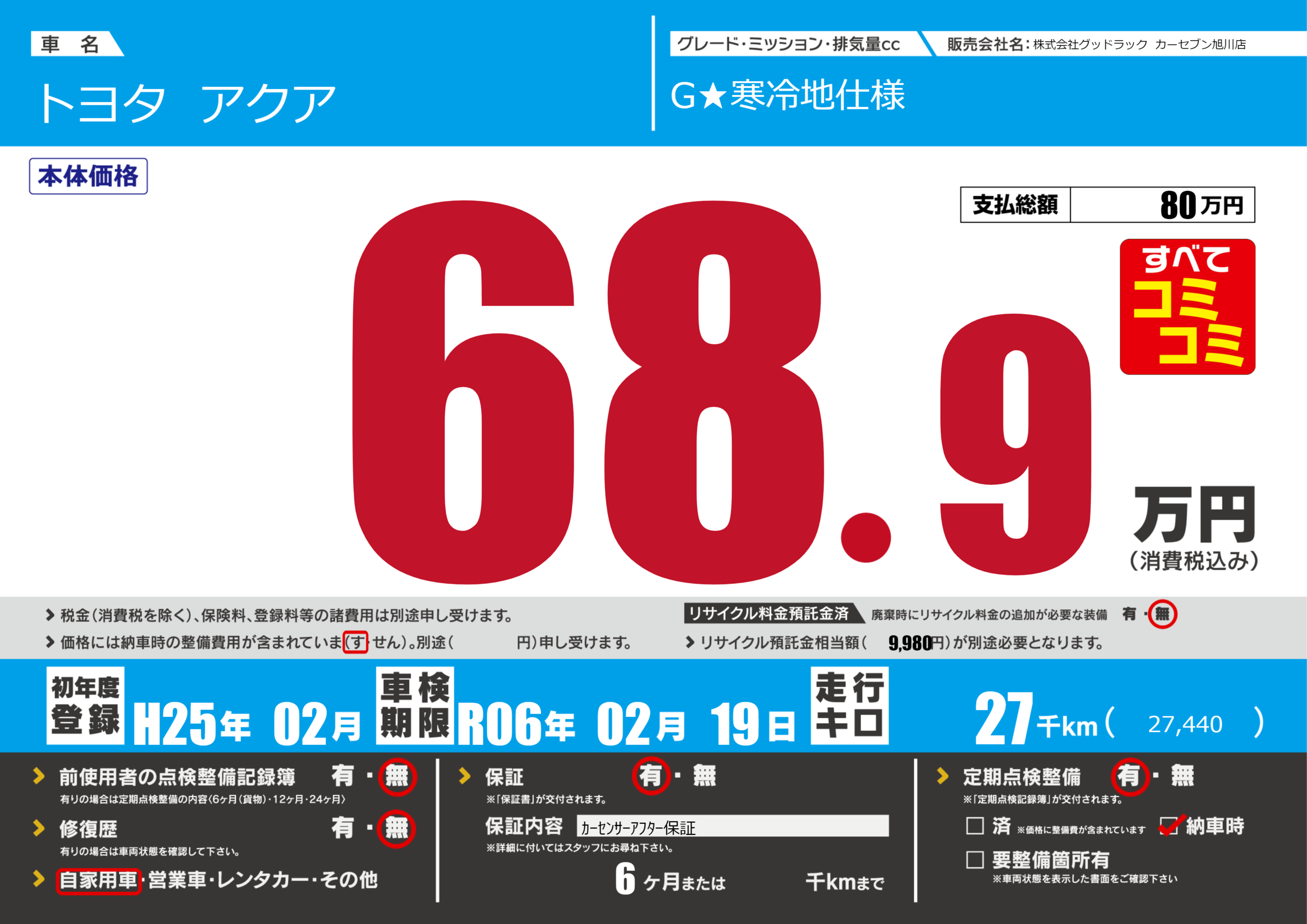 | 定期点検整備 | 定期点検整備あり 納車時あり | ||