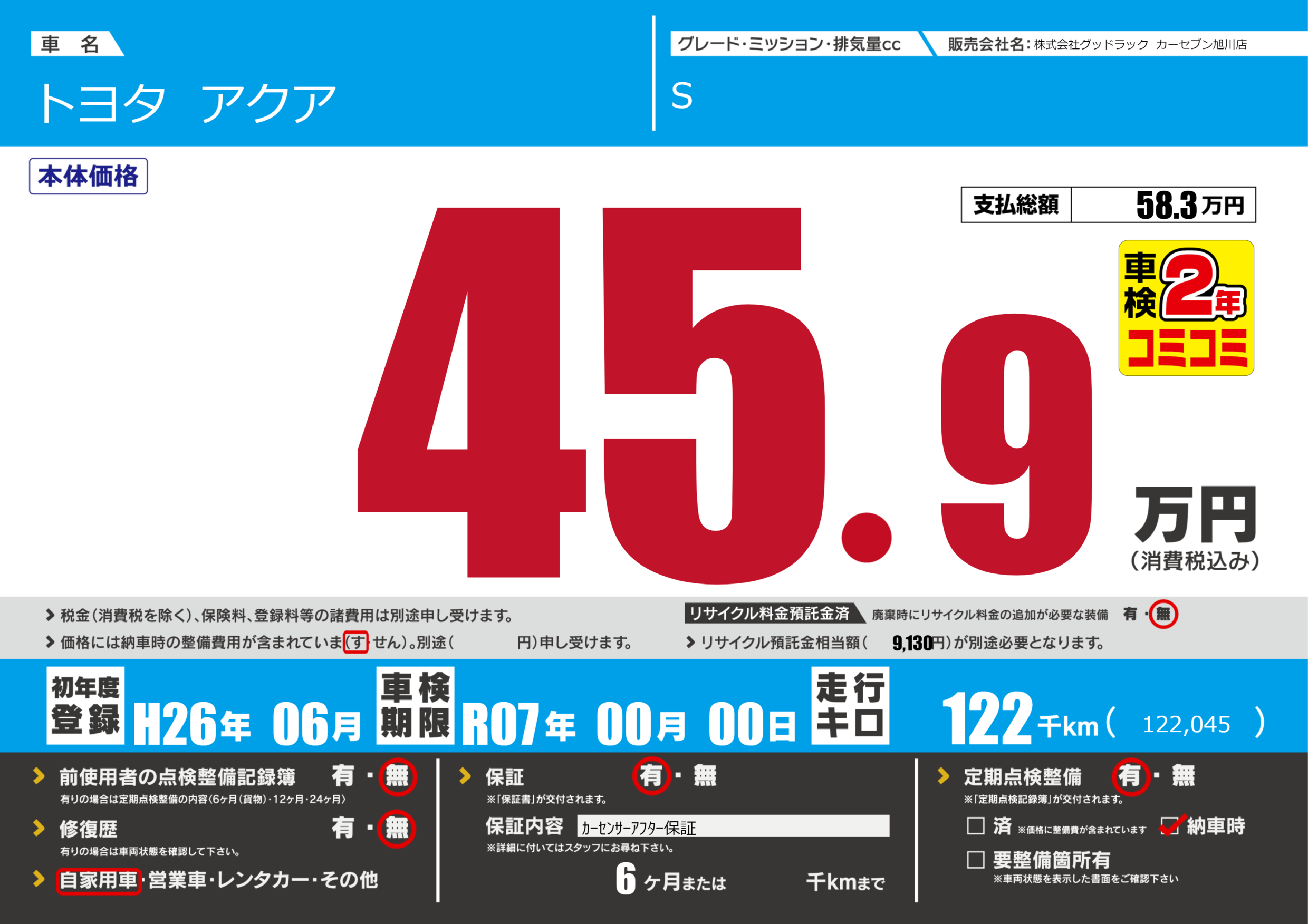 | 車名 | トヨタ アクア | グレード ミッション 排気量 |