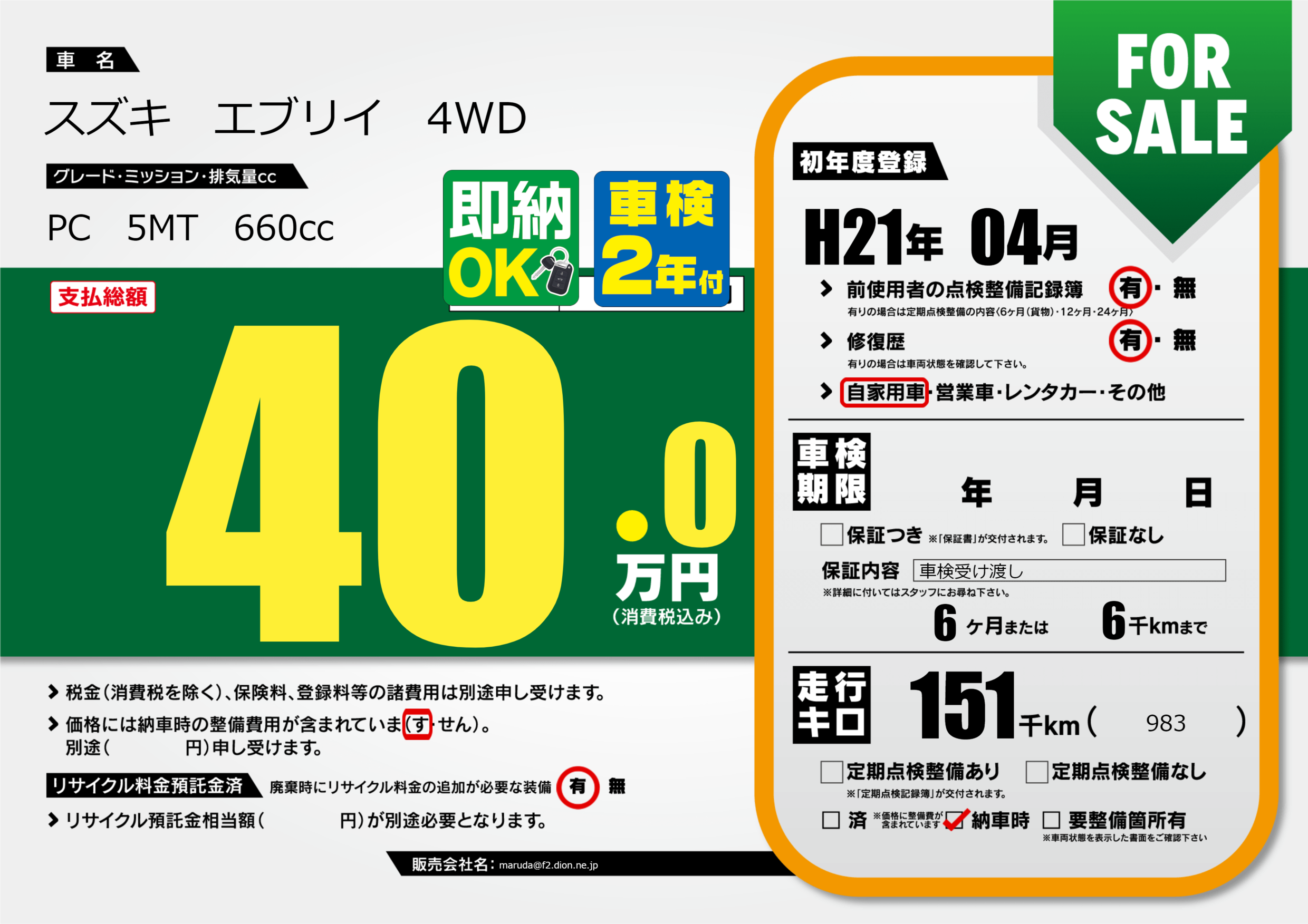 | 車名 | スズキ エブリイ 4WD | グレード ミッション 排気量 |