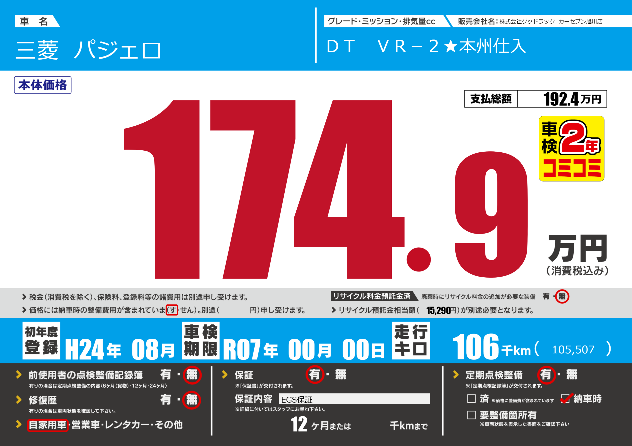 | 車検制限 | R07年 00月 00日 | ||