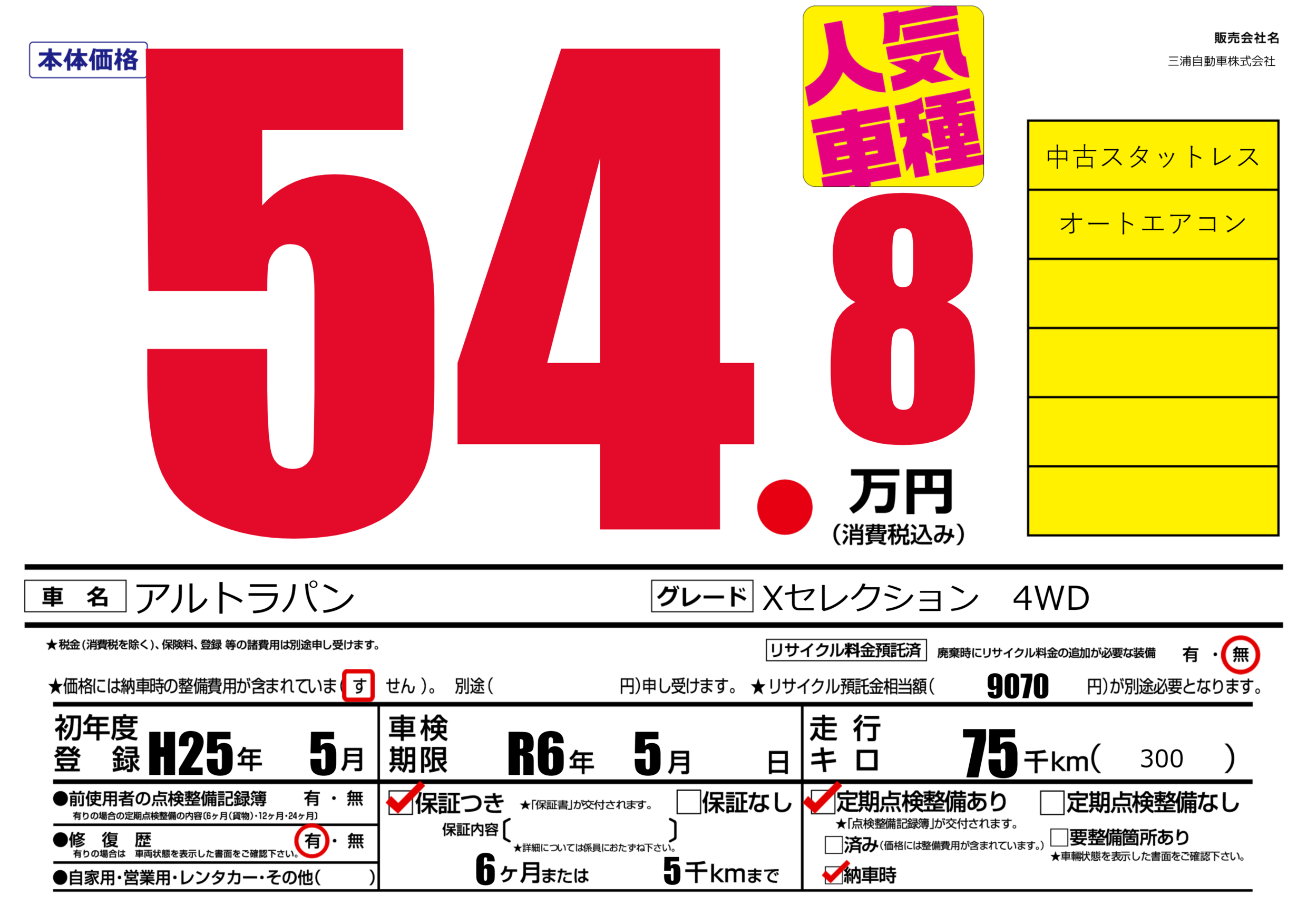 保証付き 保証内容(---) 6ヶ月または(5)千kmまで |